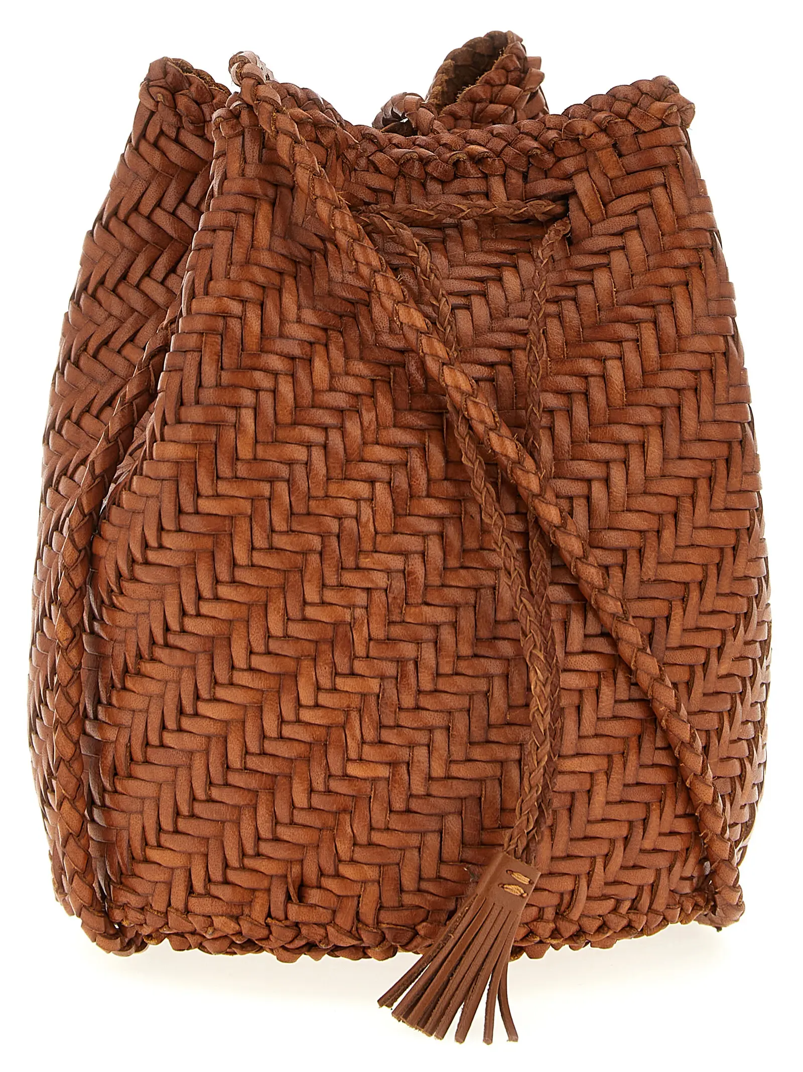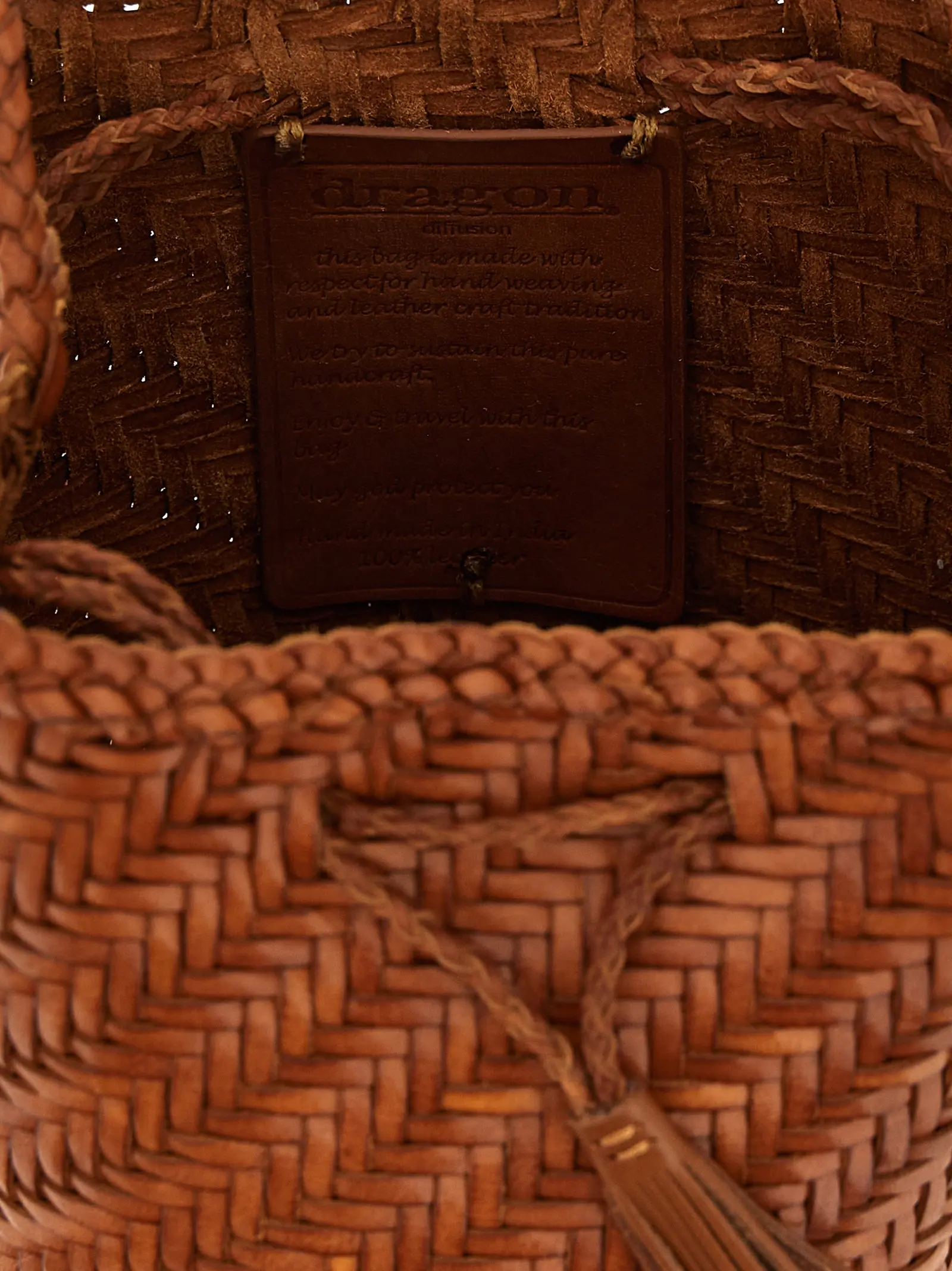 Ця жіноча сумка відро Pompom Double Jump від Dragon Diffusion виготовлена з 100% ручної роботи з буйволової шкіри з витонченим плетінням у стилі кошика, що підкреслює її унікальність і довговічність. Відсутність підкладки та затягуючий шнур забезпечують легкість і функціональність, а плечовий ремінь додає зручності в носінні. Вишуканий медальйон у вигляді Святого Христофора, символа захисту мандрівників, акуратно пришитий всередині, надає виробу особливого шарму та статусу.