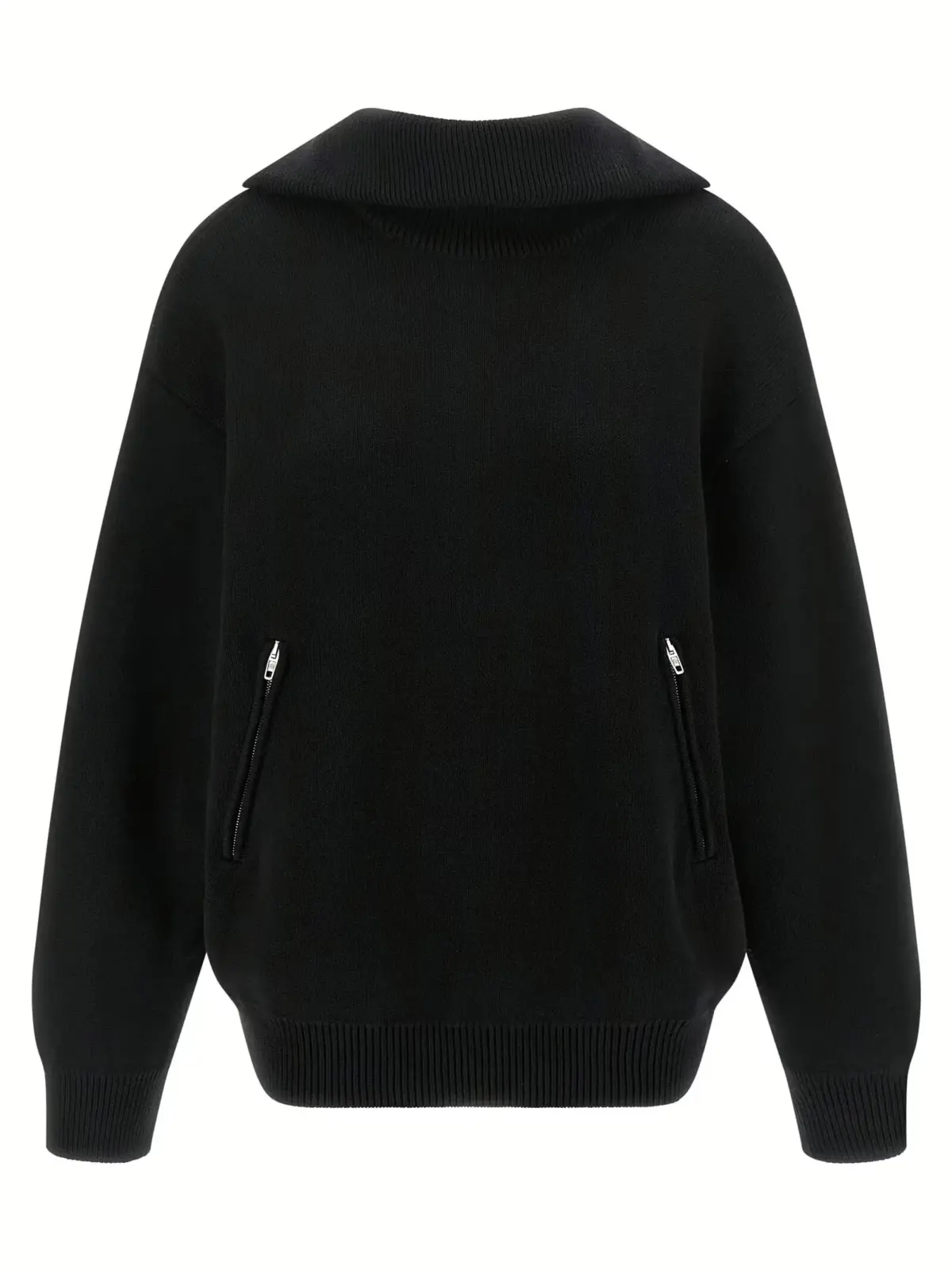 Чорний светр Back-to-Front виготовлений з 100% високоякісної бавовни, поєднує інноваційний дизайн із витонченістю: піднятий комір, застібка на спині, практичні кишені та подовжені рукави створюють стильний і універсальний образ, що підкреслює статус та бездоганний смак.