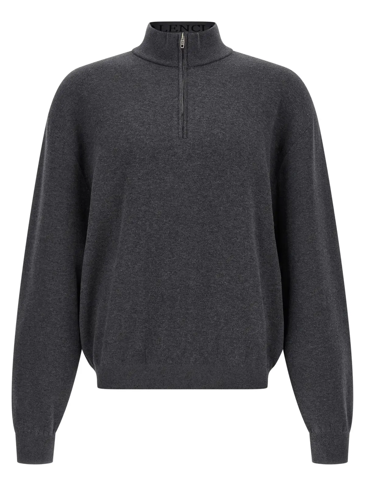 Светр Balenciaga сірого кольору, виготовлений з органічної бавовни найвищої якості, поєднує в собі інноваційний дизайн із напівзастібкою та коміром у стилі тракера, що підкреслює статус і бездоганний стиль. Універсальний і комфортний, він стане вишуканим акцентом у будь-якому образі.
