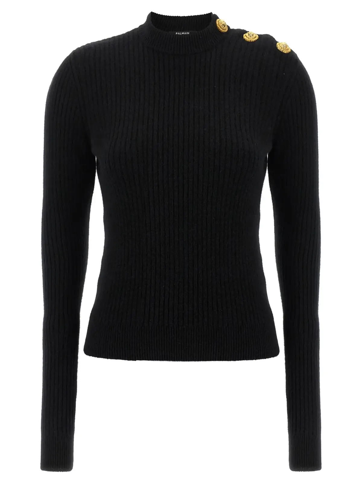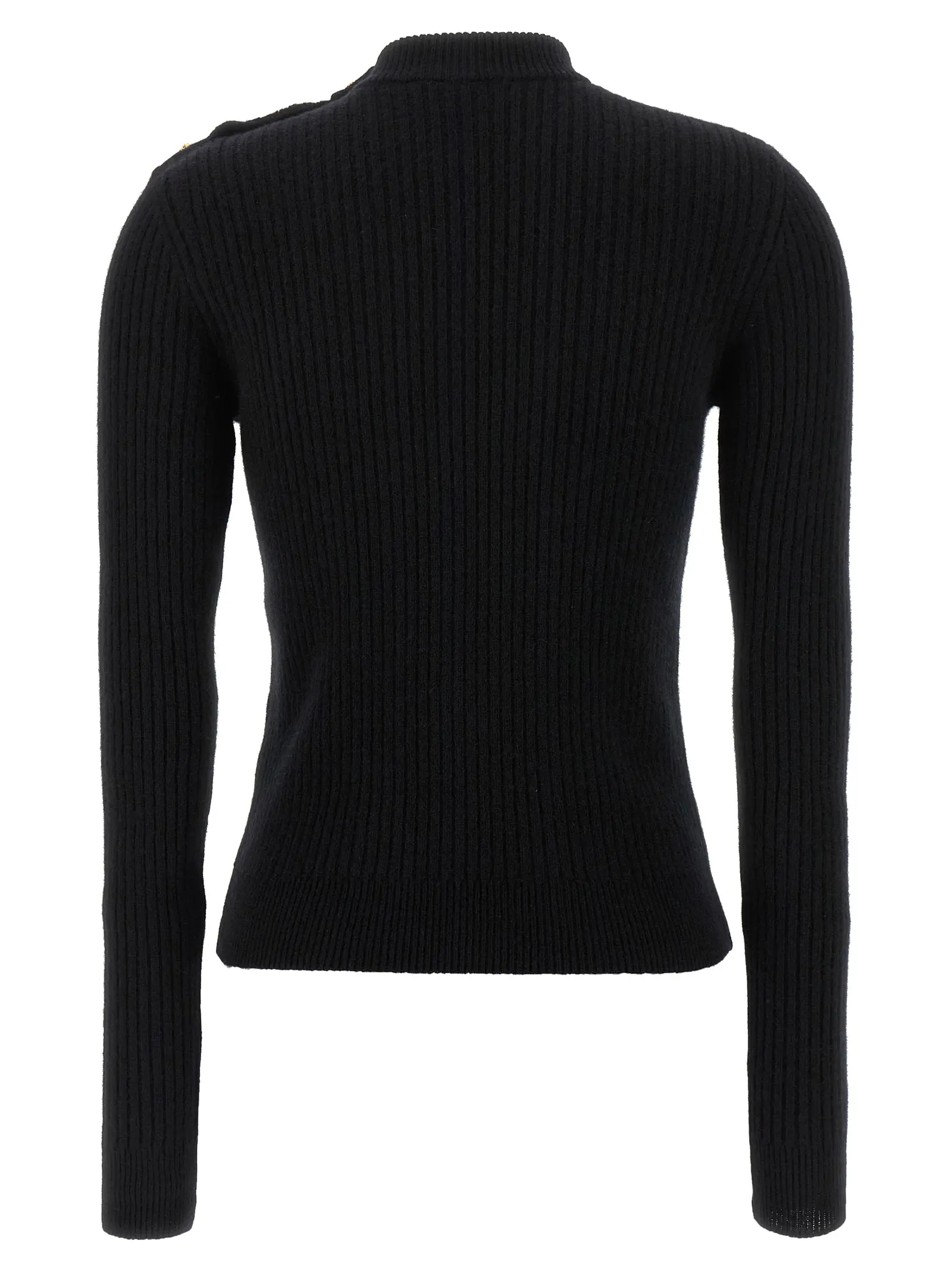 Чорний жіночий светр виготовлений із суміші кашеміру та virgin вовни, що гарантує неймовірну м’якість і тепло. Вишуканий дизайн з металевою кнопкою на лівому плечі, круглим вирізом і довгими рукавами підкреслює елегантність і статус, поєднуючи інноваційність із універсальністю для будь-якого образу.