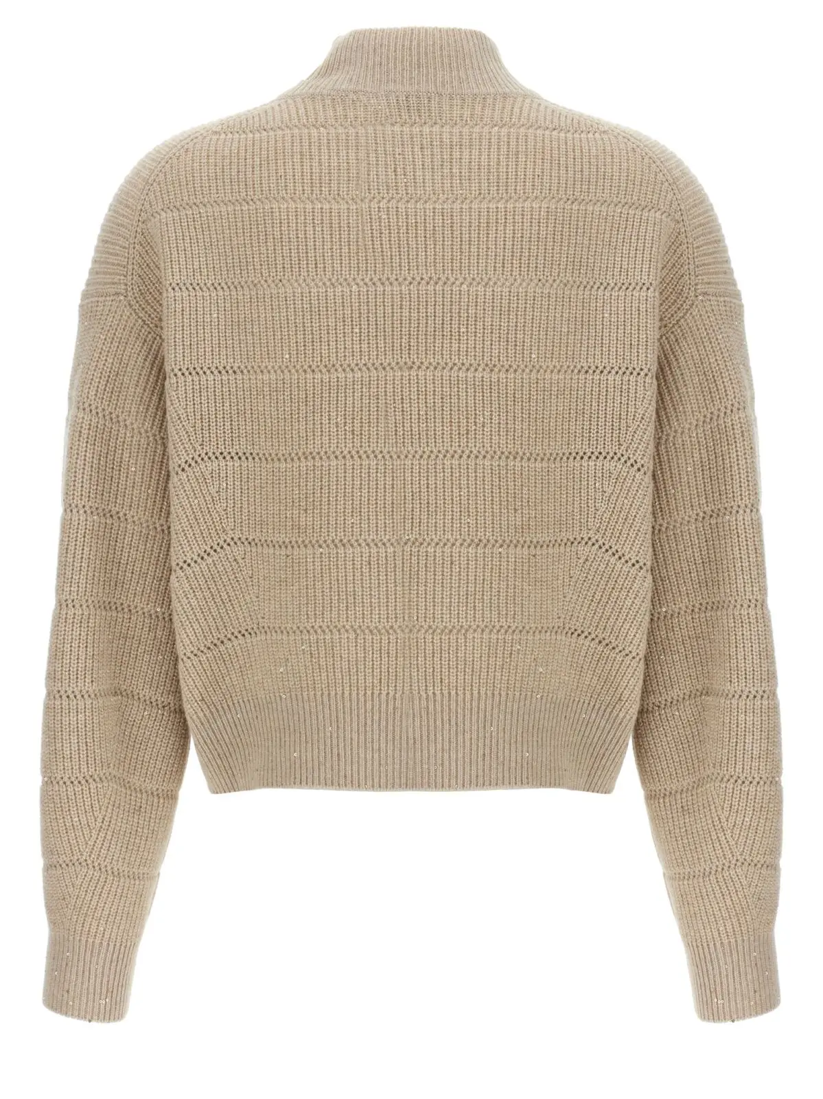 Цей вишуканий бежевий светр зі 100% вовни поєднує в собі інноваційний дизайн з мереживною в’язкою та вишуканими паєтками, створюючи неповторний образ. Короткий крій, високий комір і довгі рукави з манжетами підкреслюють елегантність і статус, роблячи його ідеальним вибором для вишуканого повсякденного стилю.