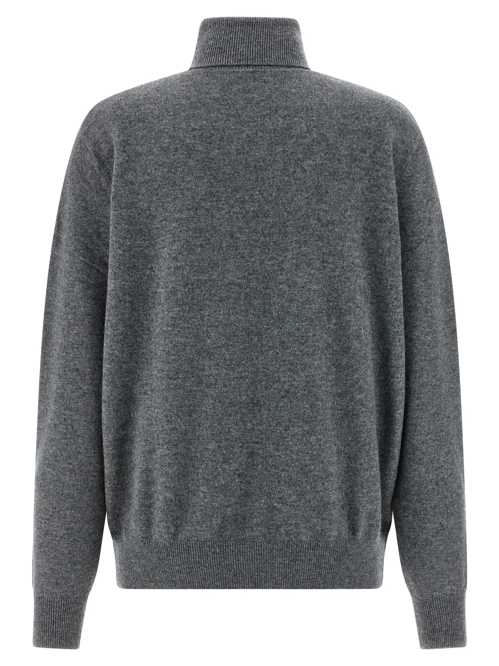 Светр з високим відкладним коміром. Виготовлений з екстра фінеї мериносової вовни та кашеміру. Має довгі рукави з манжетами. Наявні занижені плечі. Склад містить 70% мериносова вовна та 30% кашемір.