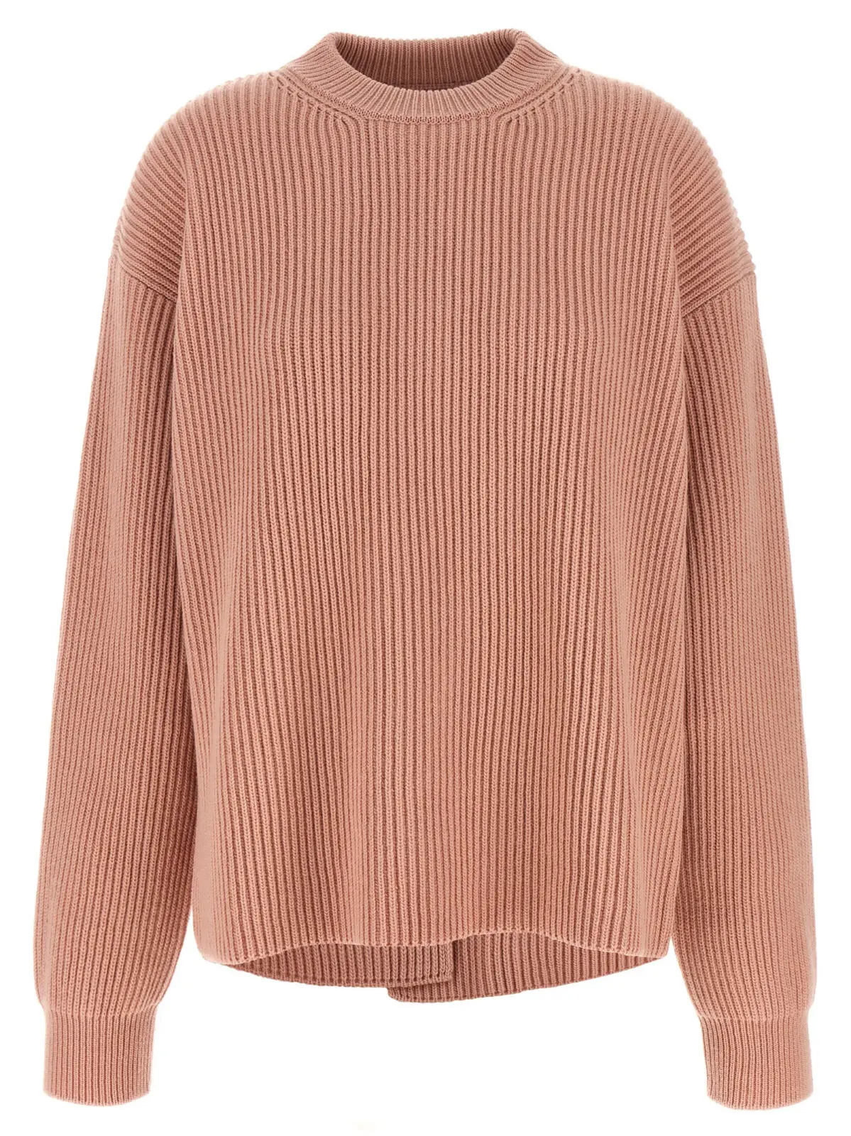 Рожевий светр із середньої щільності вовни мериноса поєднує в собі витончену текстуру з ребристим візерунком, класичний круглий виріз та асиметричний поділ низу, підкреслюючи сучасний стиль і бездоганну якість, що гарантує комфорт і універсальність у будь-якому образі.