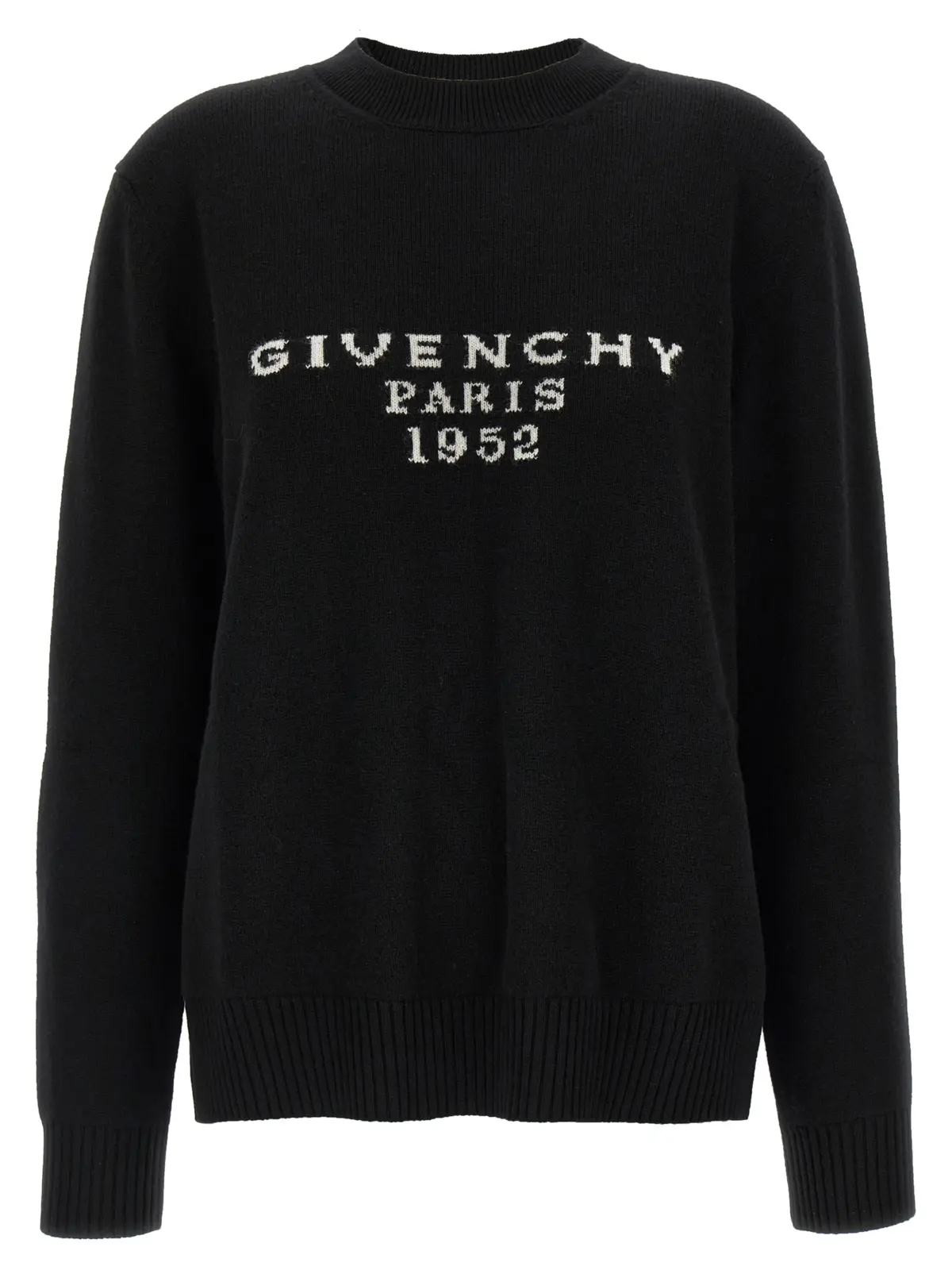 Вишуканий жіночий светр із м’якої вовни та кашеміру, що поєднує комфорт і розкішність, прикрашений жакардовим написом GIVENCHY Paris 1952 спереду. Елегантний дизайн із круглим вирізом, довгими рукавами з манжетами та злегка опущеними плечима підкреслює витонченість і сучасний стиль, створюючи неперевершений образ для будь-яких випадків.