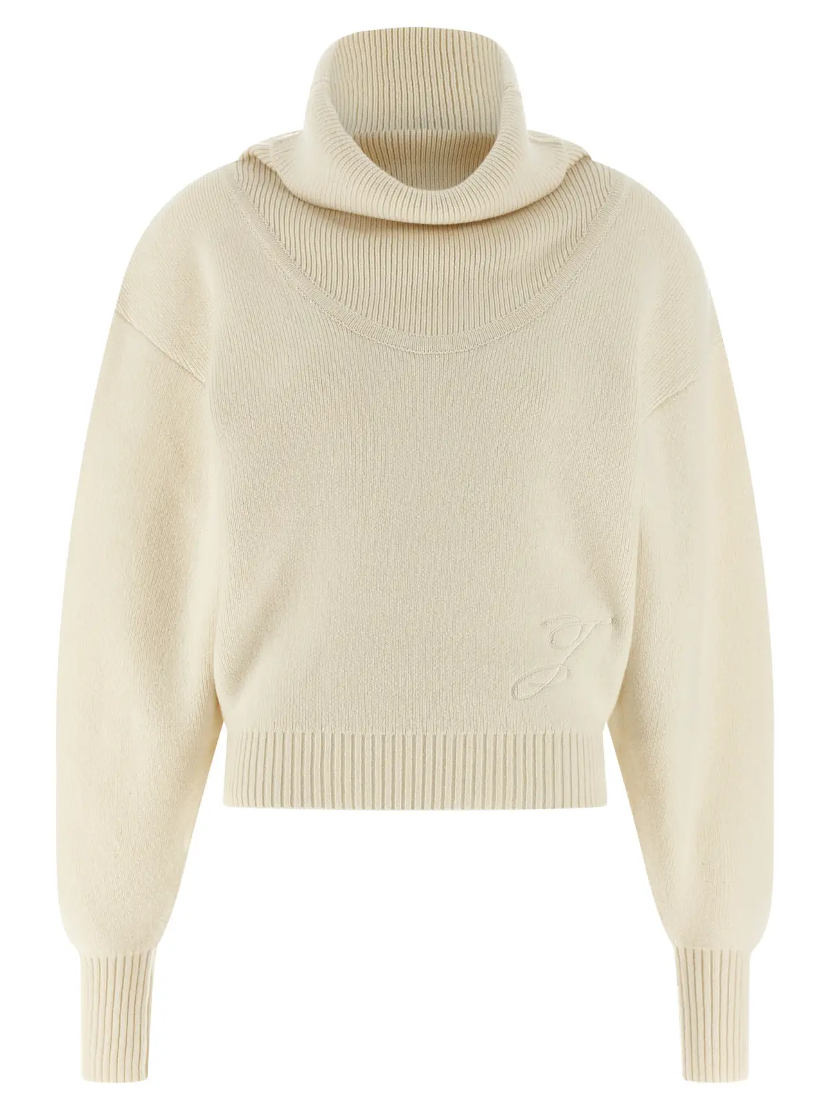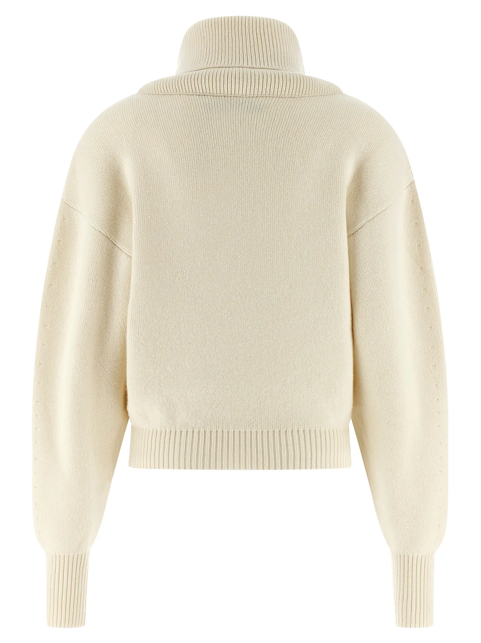 Вишуканий светр із 90% нової вовни та 10% кашеміру поєднує неперевершену м’якість і тепло, підкреслюючи статус і вишуканий стиль. Унікальний дизайн із високим коміром форми кратера, широкими довгими рукавами з манжетами та заниженими плечима створює сучасний силует, а тонка вишивка логотипу додає нотку елегантності й інноваційності.