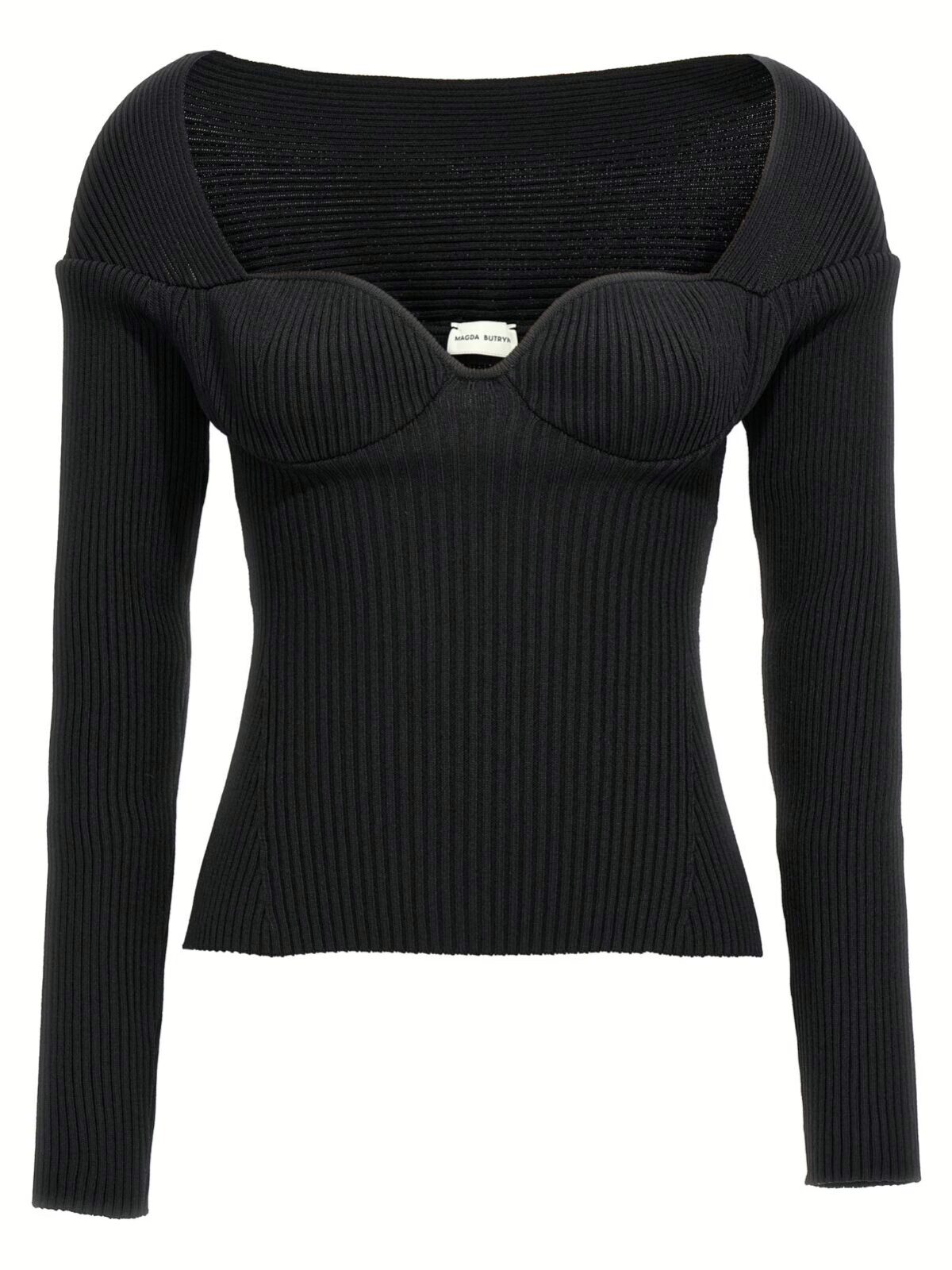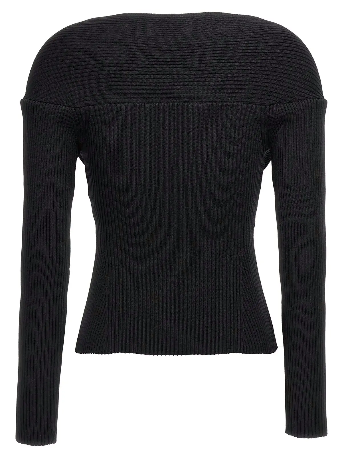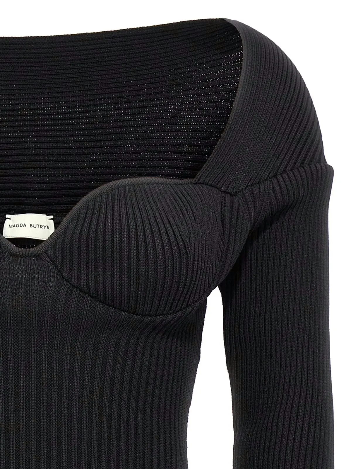 Светр Magda Butrym в елегантному чорному кольорі виготовлений з високоякісного в’язкого складу, що містить 65% віскози та 35% поліестеру, який надає неймовірну м’якість та комфорт. Його витончений дизайн з серцевидним вирізом та довгими рукавами підкреслює жіночність та елегантність, створюючи враження бездоганного стилю. Цей светр стане універсальним доповненням до вашого гардеробу, легко комбінуючись як з повсякденними образами, так і з вечірніми вбраннями. Інноваційна текстура та сучасний силует підкреслюють статус власниці, надаючи впевненості в будь-якій ситуації. Додатково, використані матеріали є екологічно чистими, що свідчить про відповідальний підхід до моди. Придбавши цей светр, ви обираєте не лише стиль, а й справжню розкіш у кожному дотику.