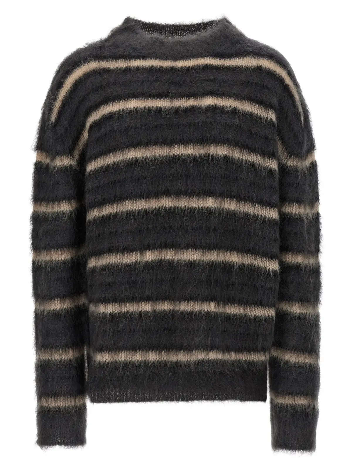 Светр із м’якого мохеру з елегантним багатобарвним смугастим візерунком, круглим вирізом і довгими манжетами, поєднує інноваційність матеріалів і бездоганний дизайн, підкреслюючи статус і вишуканий стиль сучасного чоловіка.