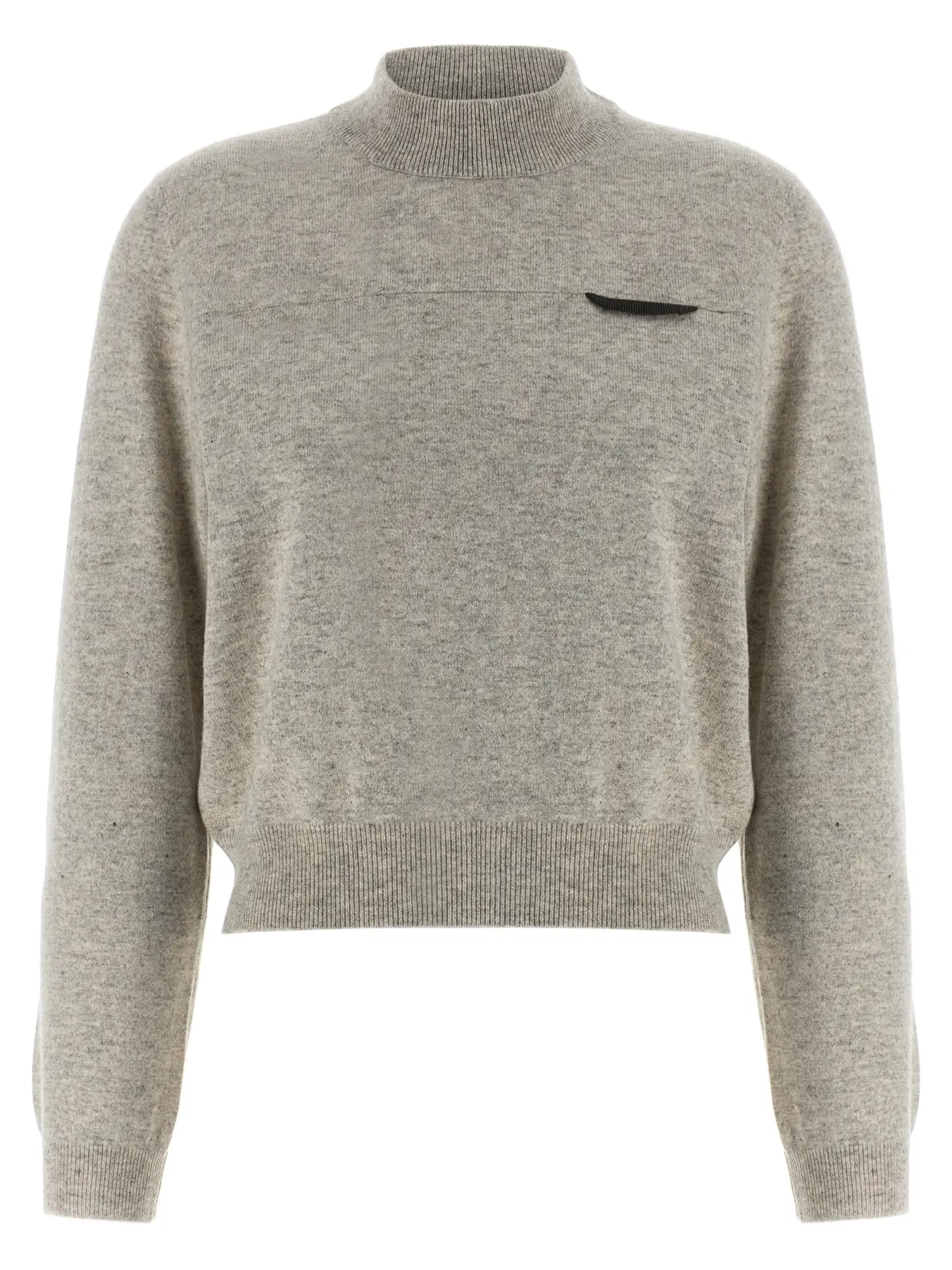 Вишуканий жіночий светр Monile Brunello Cucinelli виконаний із 100% високоякісної вовни, поєднує елегантний високий комір із довгими рукавами на манжетах та вишуканою прикрасою у вигляді каменю, підкреслюючи статус і неперевершений стиль у будь-якому образі.