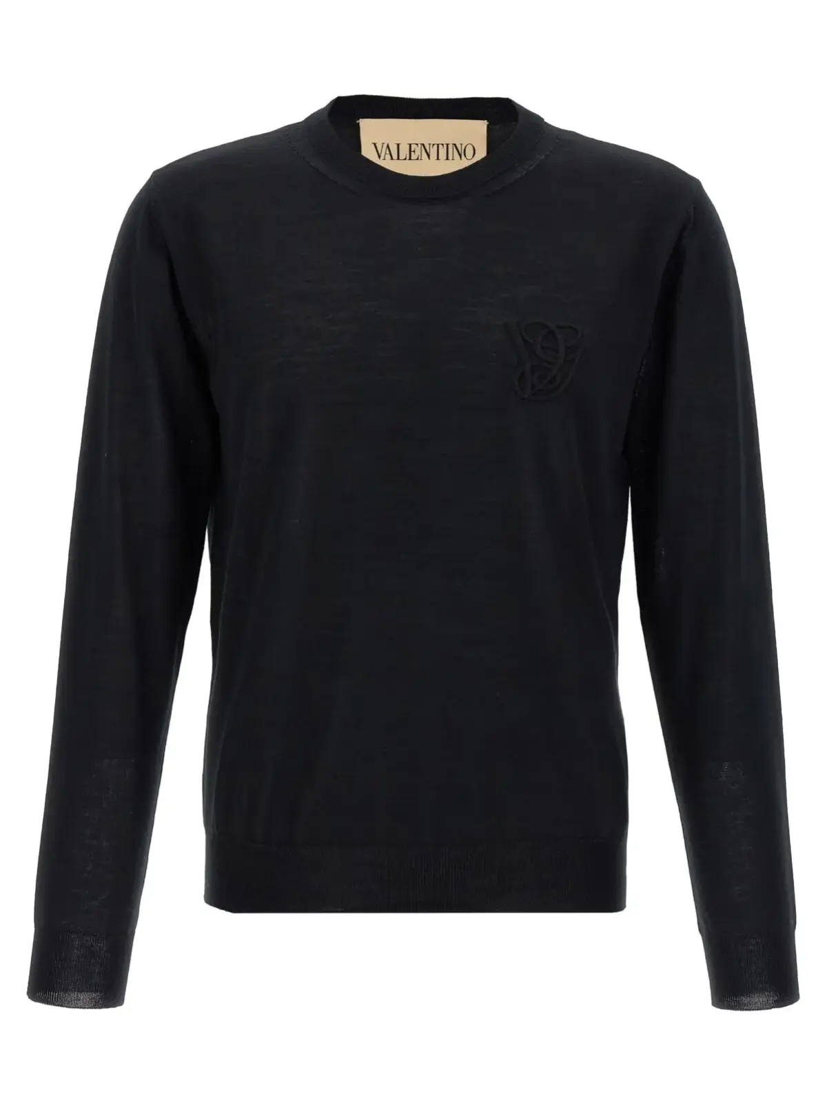 Чорний светр з легкої вовни найвищої якості, оздоблений витонченим вишитим логотипом у тон, поєднує елегантність і комфорт завдяки класичному круглому вирізу та довгим рукавам із манжетами. Цей виріб підкреслює статус і вишуканий стиль сучасного чоловіка, гарантуючи універсальність у будь-якому образі.