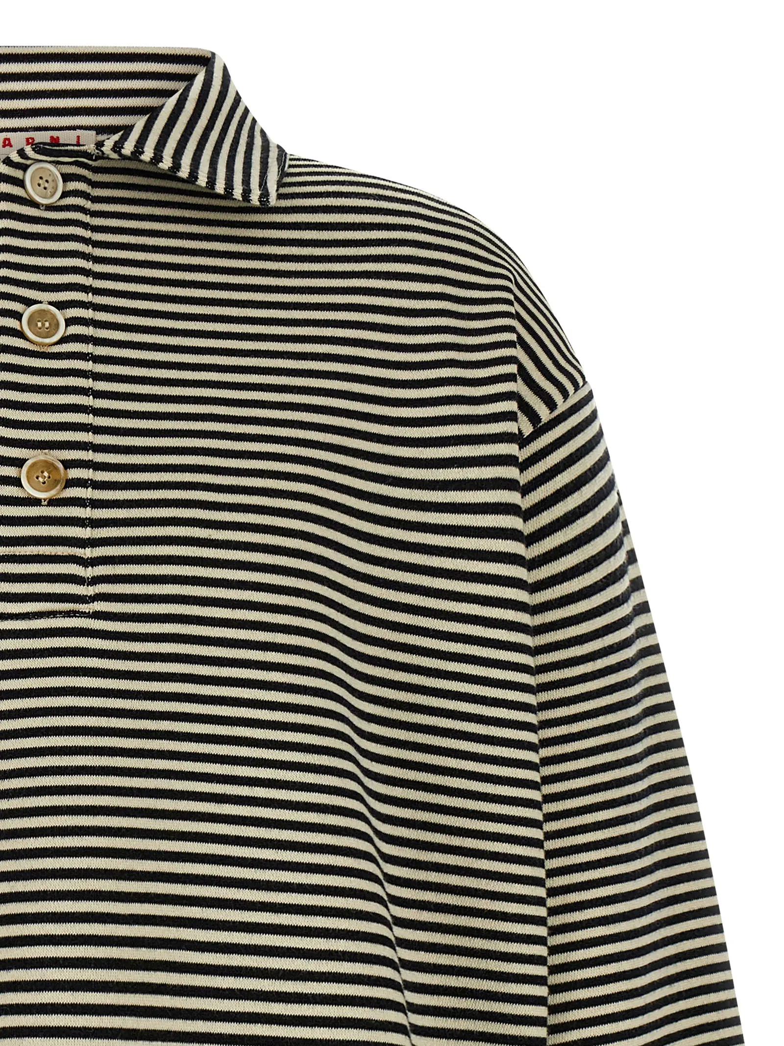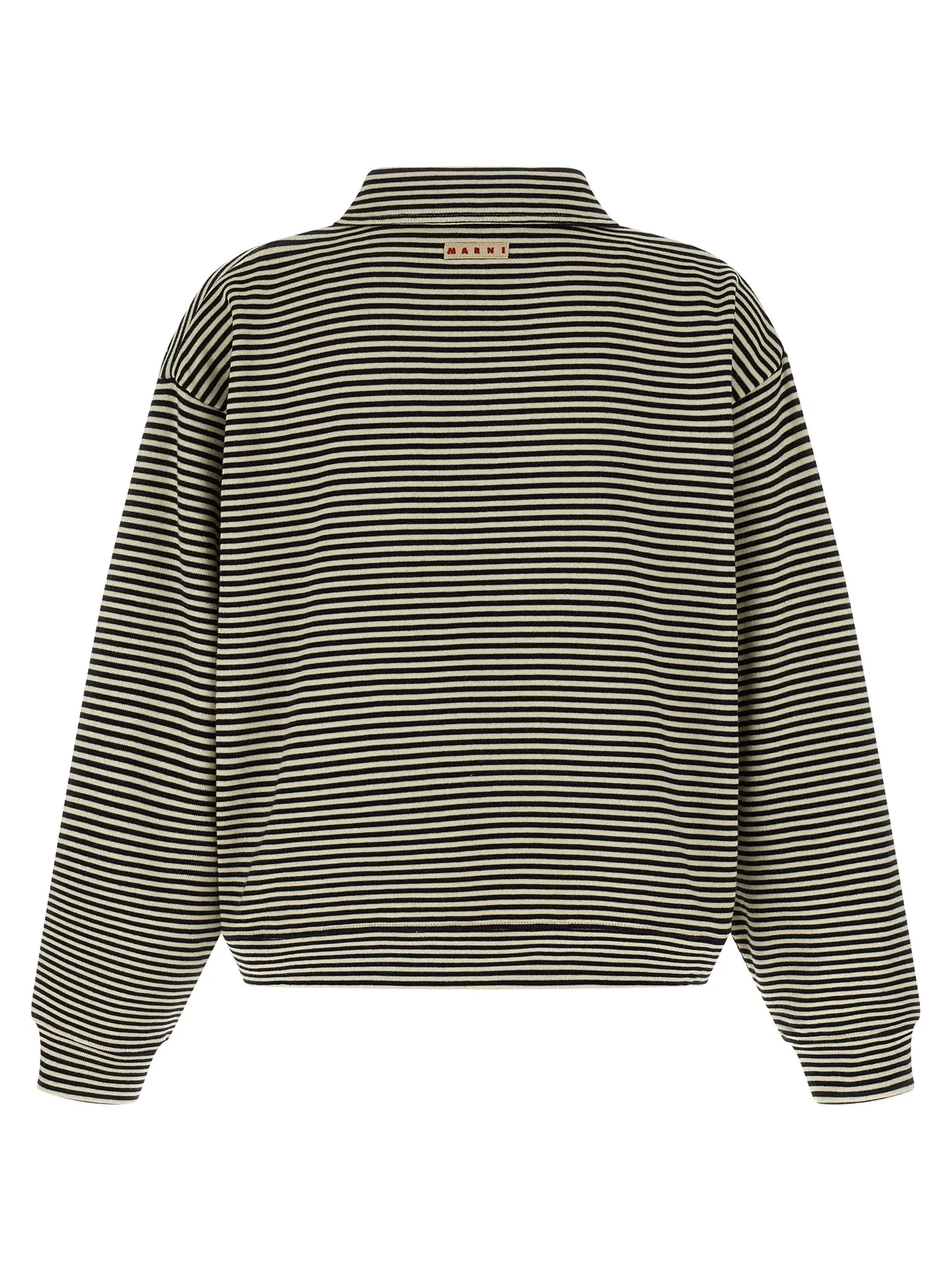 Чорний світшот із колекції Marni виготовлений із 100% смугастої бавовняної тканини, поєднуючи комфорт світшоту та елегантність поло з коміром і ґудзиками. Довгі рукави з манжетами та занижені плечі підкреслюють сучасний дизайн, що гарантує неперевершений стиль і універсальність на щодень.
