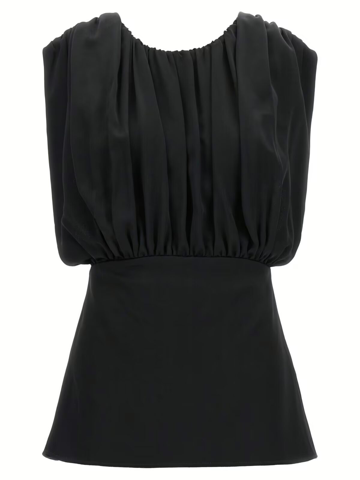 Заводите вихідні в стильному топі від Jil Sander! Чорний колір, красивий кринклінг на пластроні, круглий виріз, безрукавки та блискавка з боку – це все, що вам потрібно для створення неперевершеного образу. Виготовлений з 74% ацетату та 26% віскози, цей топ не тільки виглядає чудово, але й дуже комфортний у носінні. Замовте його вже сьогодні та відчуйте себе справжньою зіркою!