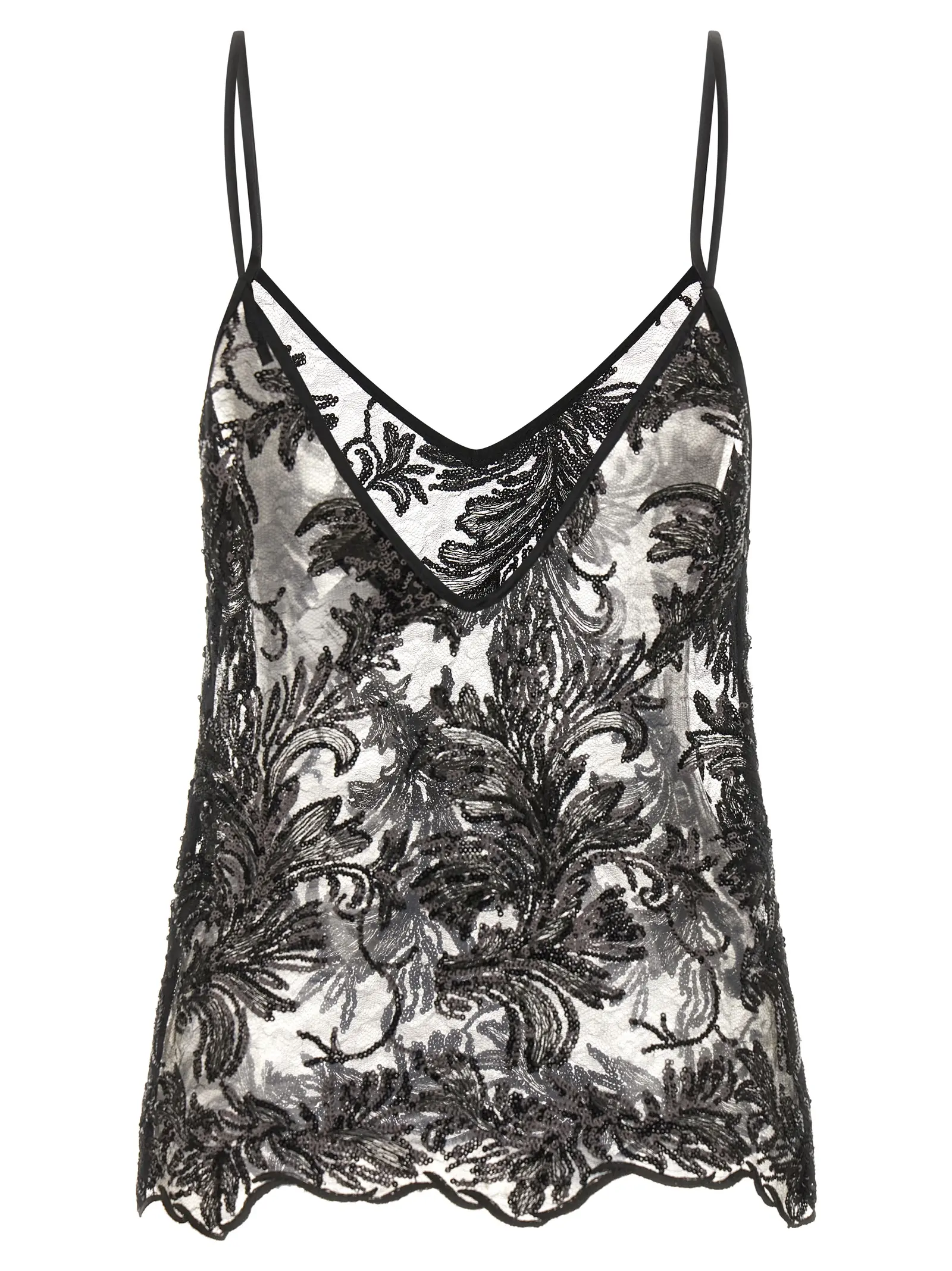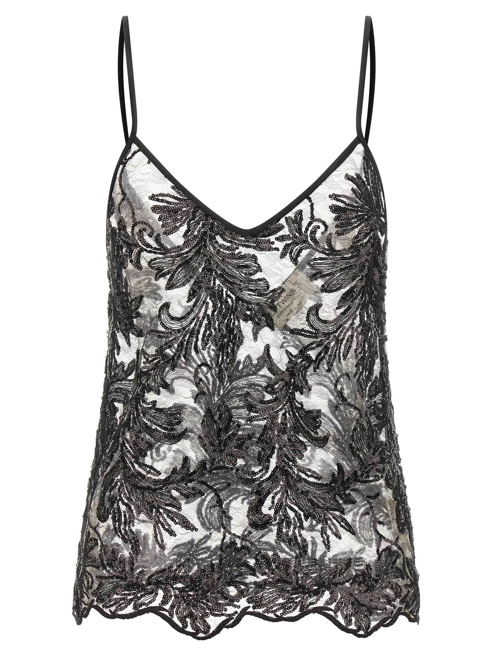 Цей витончений топ виконаний із напівпрозорого мережива високої якості, оздоблений вишуканими аплікаціями з паєток, що додають блиску та неповторного шарму. Елегантний дизайн з широким V-подібним вирізом спереду і ззаду, тонкими бретелями та асиметричним поділом підкреслює жіночність і стиль, забезпечуючи універсальність для будь-якого образу.