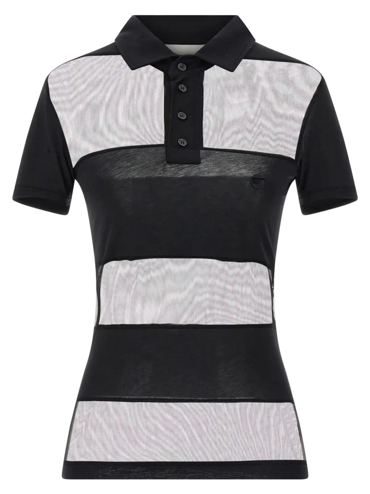 Цей напівпрозорий топ від Coperni в елегантній чорній смужці поєднує стильний дизайн з високоякісними матеріалами: 50% бавовни, 41% поліаміду та 9% еластану. Витончений комір-поло, V-подібний виріз і короткі рукави підкреслюють жіночність, надаючи виробу універсальності для будь-яких випадків. Інноваційна конструкція панелей забезпечує комфорт та свободу рухів, а також відповідає сучасним екологічним стандартам. Цей топ стане ключовим елементом у вашому гардеробі, підкреслюючи статус і бездоганний смак.