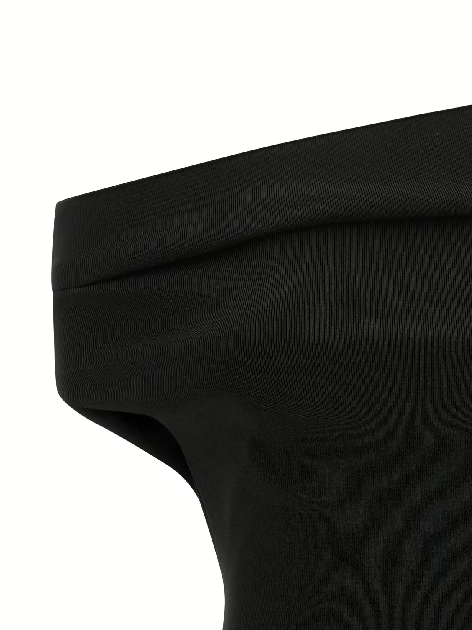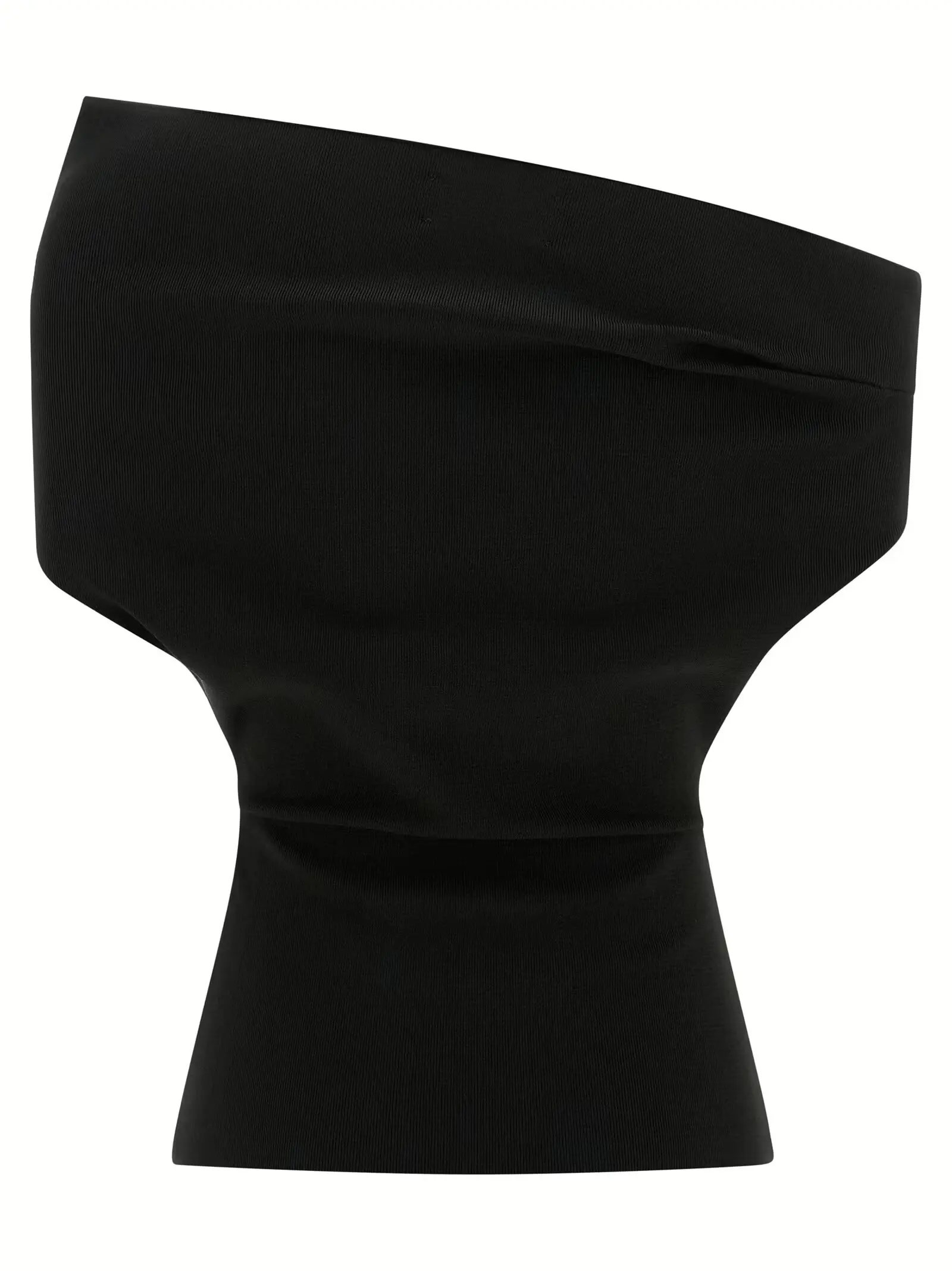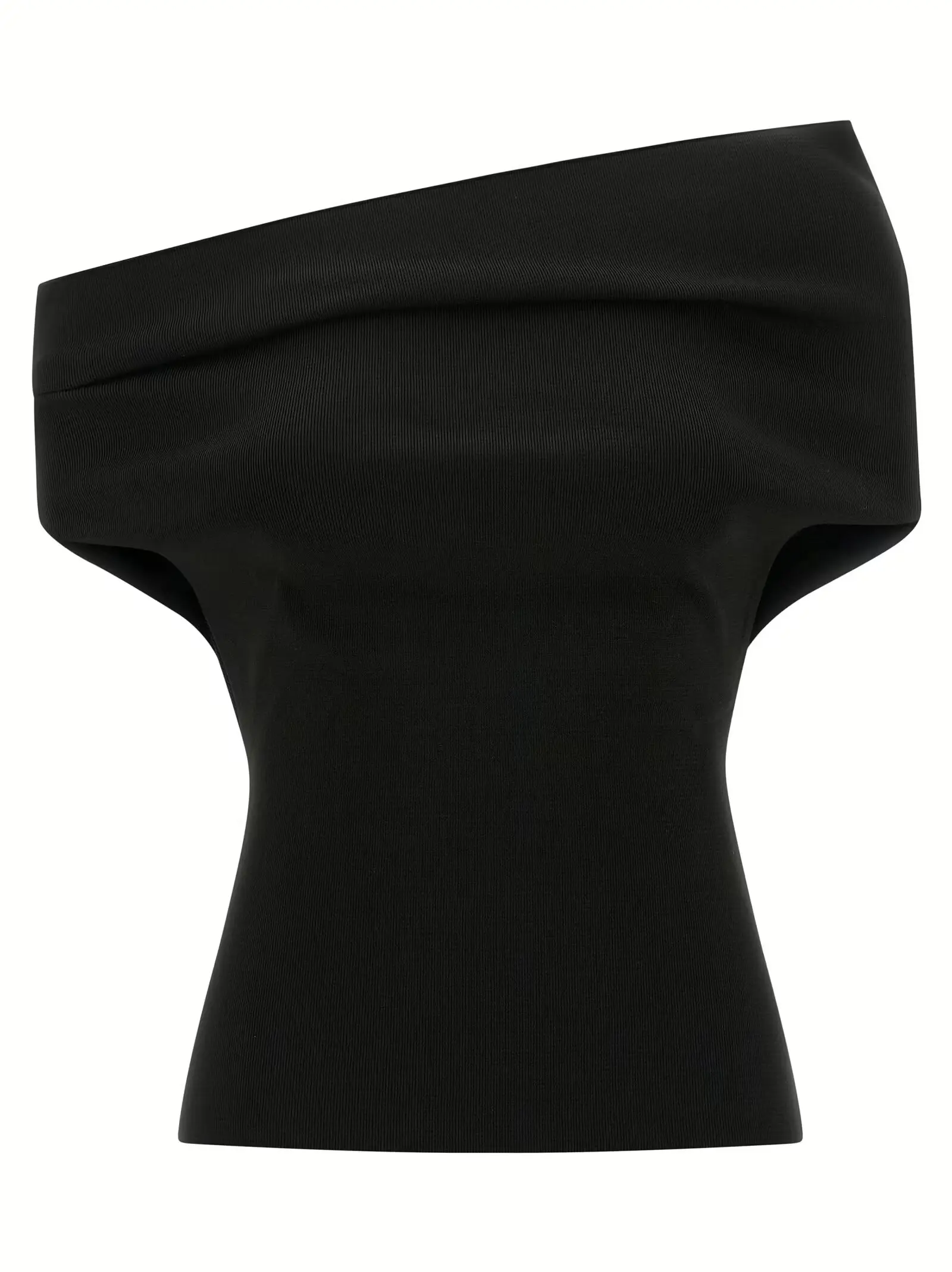 Чорний топ без плечей з модульними шальними плечима та короткими рукавами виготовлений з еластичного трикотажу на основі віскози, нейлону та еластану, що забезпечує ідеальну посадку та комфорт. Вишукана комбінація матеріалів і сучасний дизайн підкреслюють вишуканий стиль і статус, роблячи цей виріб універсальним для будь-яких подій.