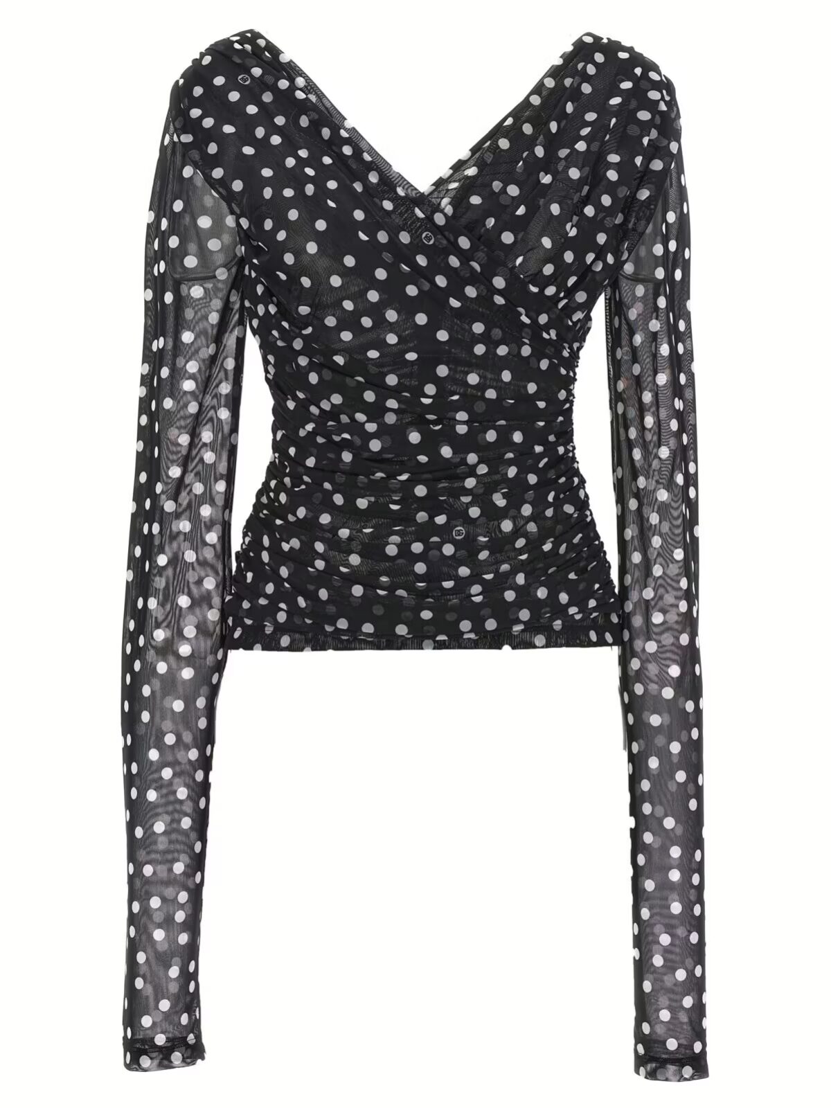 Зустрічайте неперевершений топ Dolce & Gabbana Mambo! Цей чорно-білий жіночий топ з принтом у горошок надасть вашому образу елегантного та неповторного стилю. Виготовлений з еластичного тюлю, він забезпечує ідеальну посадку та комфорт протягом усього дня.