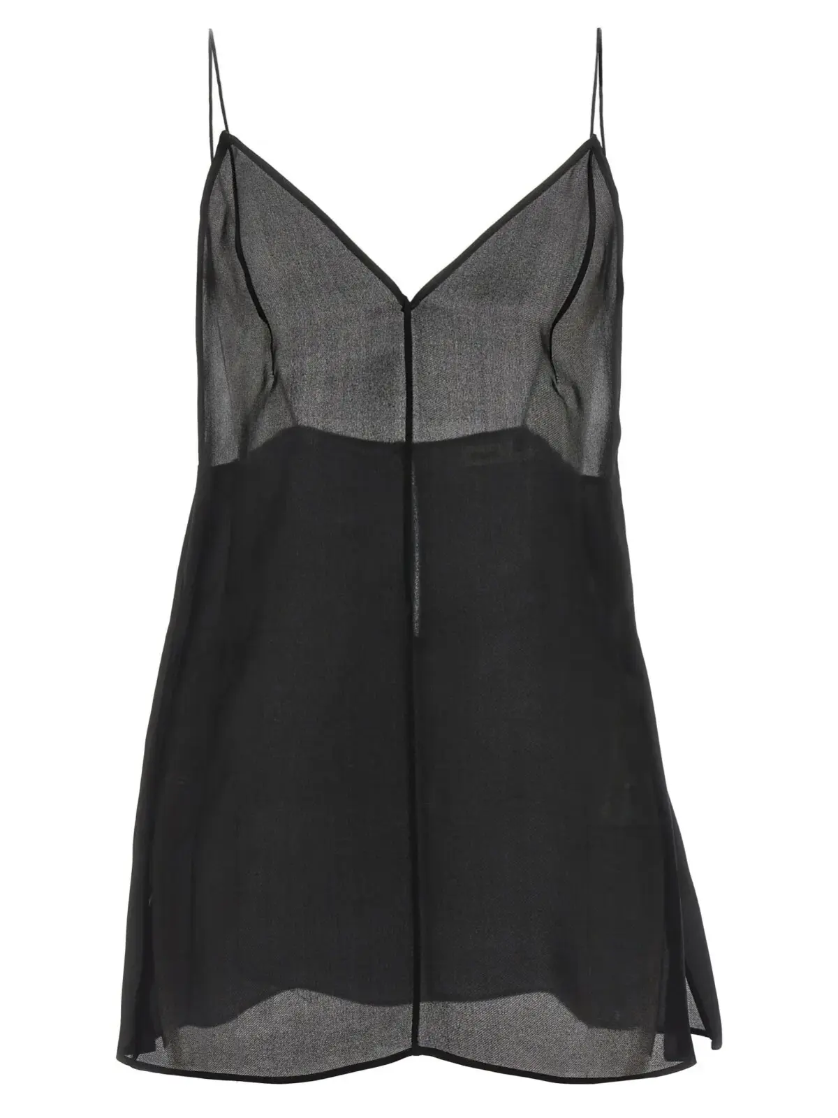 Чорний топ із напівпрозорої органзи з натурального шовку, що поєднує в собі вишуканість і легкість. Витончений V-подібний виріз спереду, тонкі бретелі, пінтучні деталі та широке квадратне декольте з застібкою на ґудзики підкреслюють інноваційний дизайн і елегантність. Універсальний і стильний вибір для створення неповторного образу високого класу.