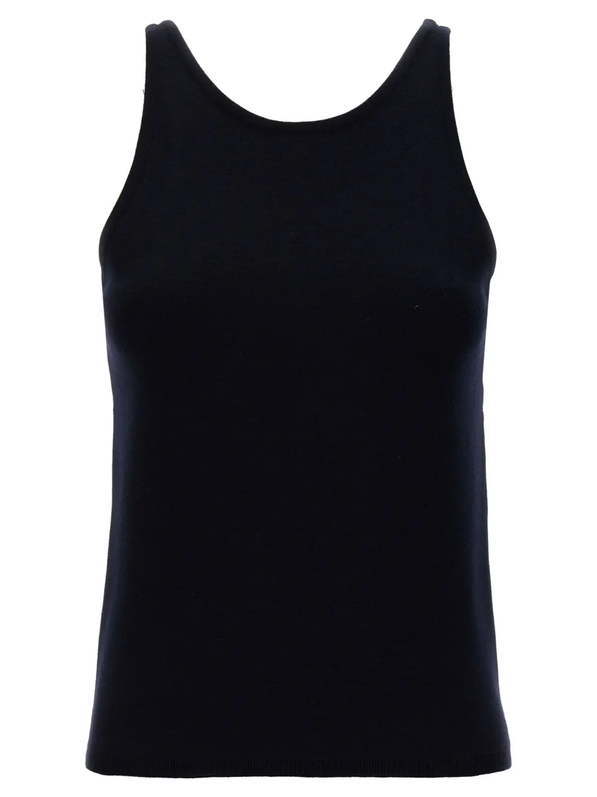 Топ Knit Max Mara в синьому кольорі – це жіночий топ зі стрункими бретелями та круглим вирізом. Виготовлений з розтяжної вовняної тканини, яка складається з 79% вірджинської вовни, 19% поліаміду та 2% еластану.