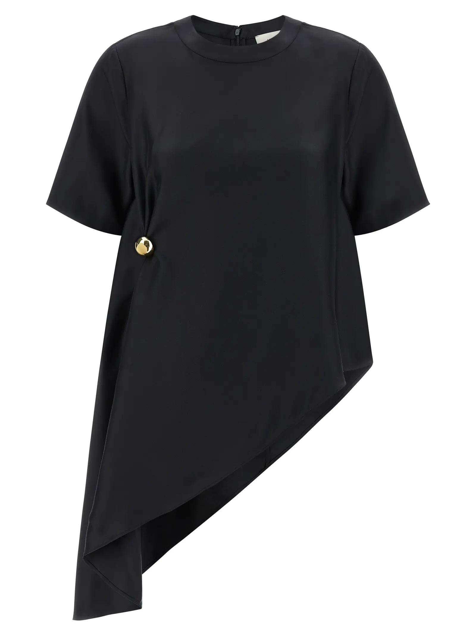 Асиметричний край низу та металевий фіксатор збоку створюють об’ємне драпірування, що надає трапецієподібній формі візуального динамізму. Натуральний шовковий твіл виразно окреслює короткі рукави та лаконічний круглий виріз. Блискавка ззаду завершує конструкцію, дозволяючи зосередитися на стриманому блиску благородної тканини, яка м’яко тримає кожну лінію крою.