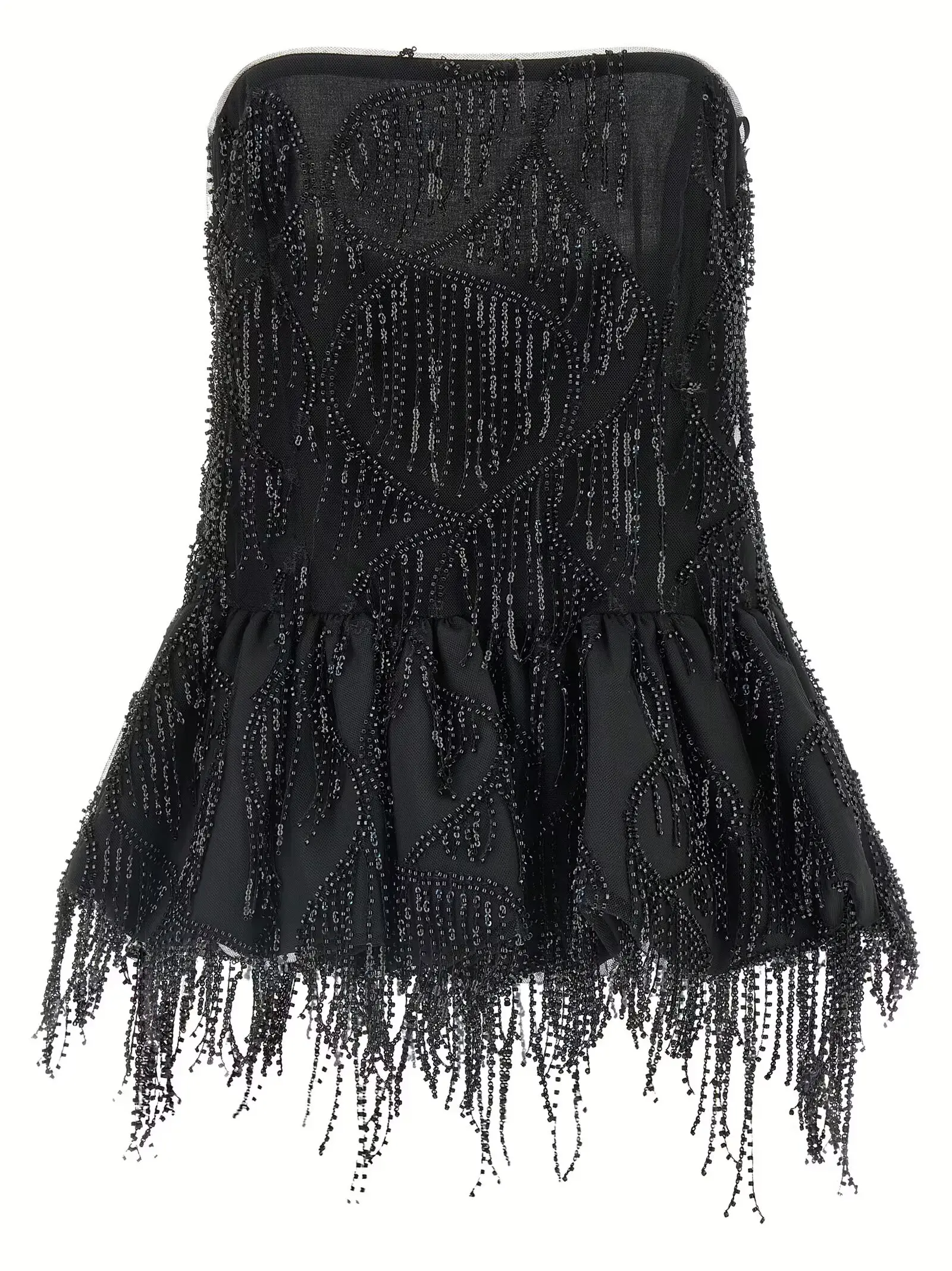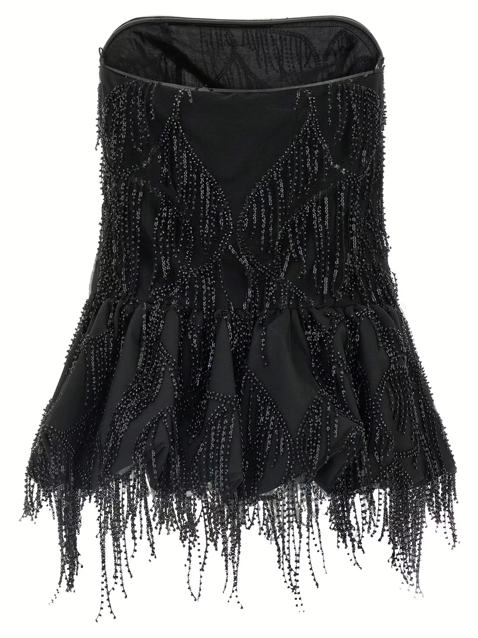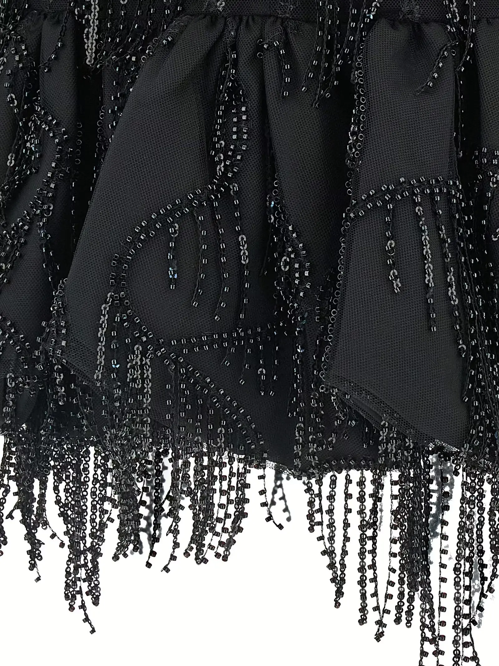 Чорний топ без рукавів із сітчастої тканини з ніжними бахромами з підвішених намистин створює ефектний об’ємний силует із спадаючим подолом. Виконаний із 100% переробленого поліестеру з віскозною підкладкою, цей модельний виріб з боковою застібкою на блискавку поєднує екологічність, сучасний дизайн і вишукану елегантність, підкреслюючи статус і витончений стиль.
