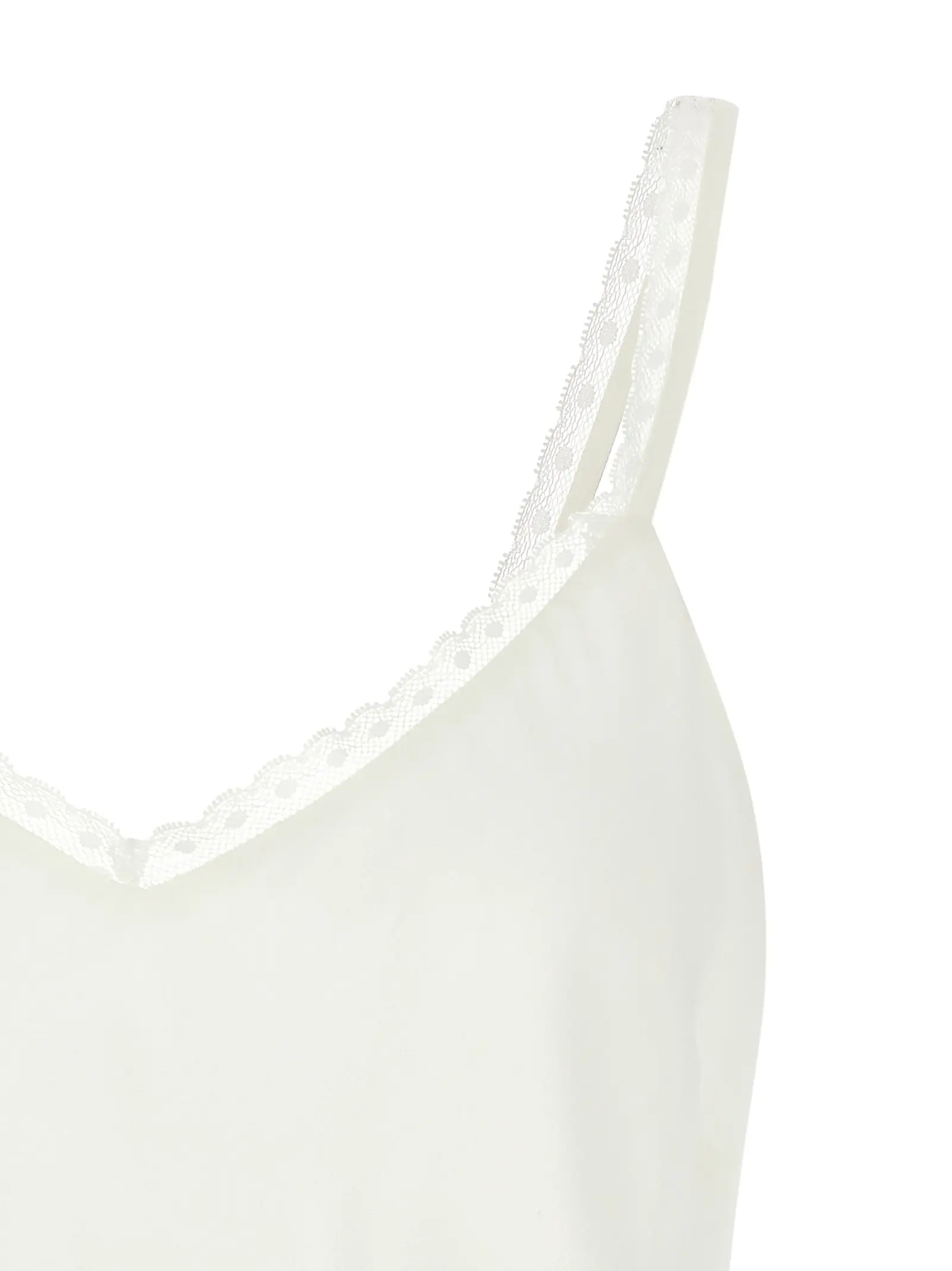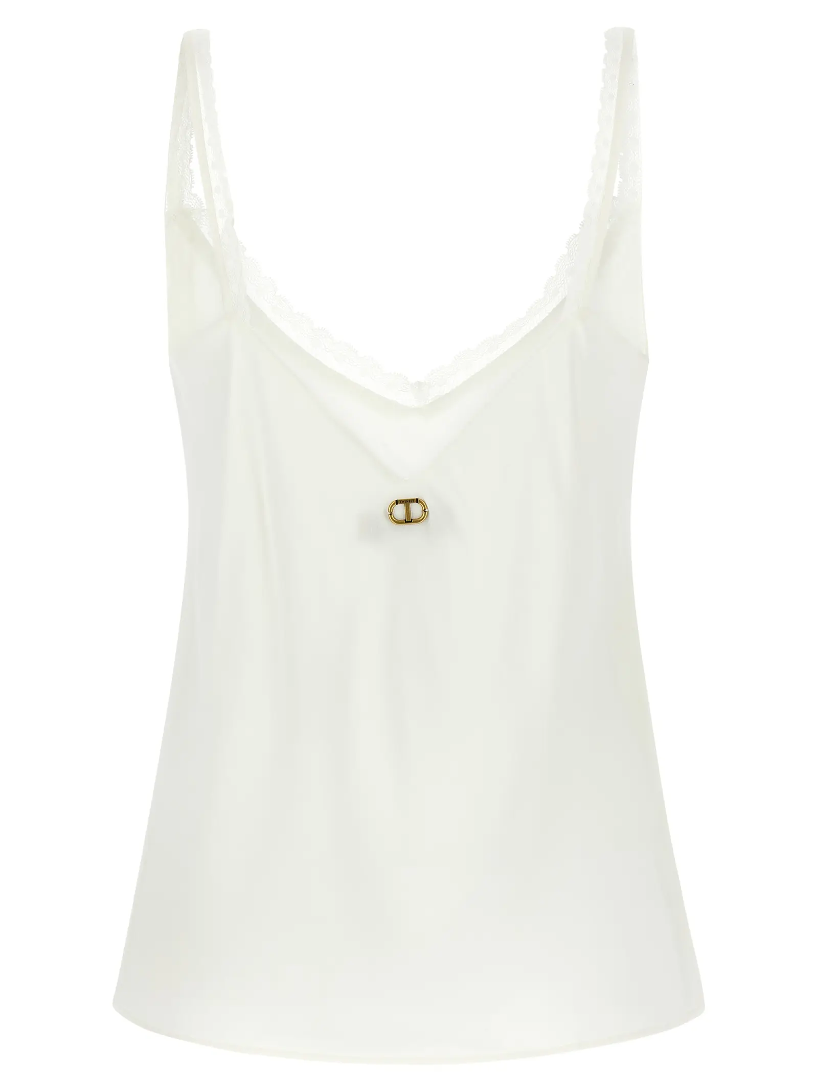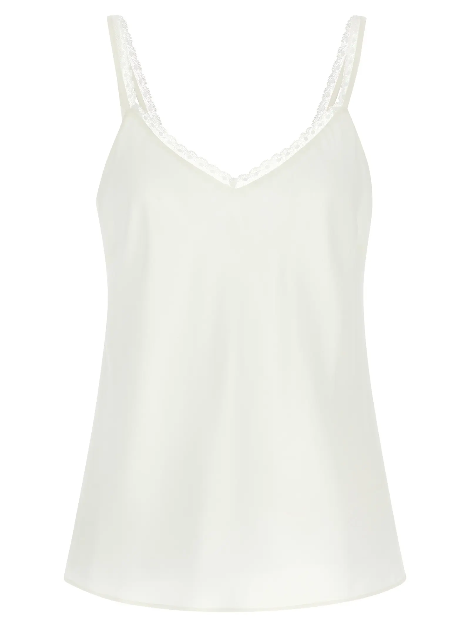 Топ з креп-шифону з віскозою та шовком. Вільний V-подібний виріз. Тонкі бретелі з обробкою у вигляді горошку. Широкий V-подібний виріз на спині. Металева овальна логотипна пластина на спині. Склад тканини 66% віскоза та 34% шовк.