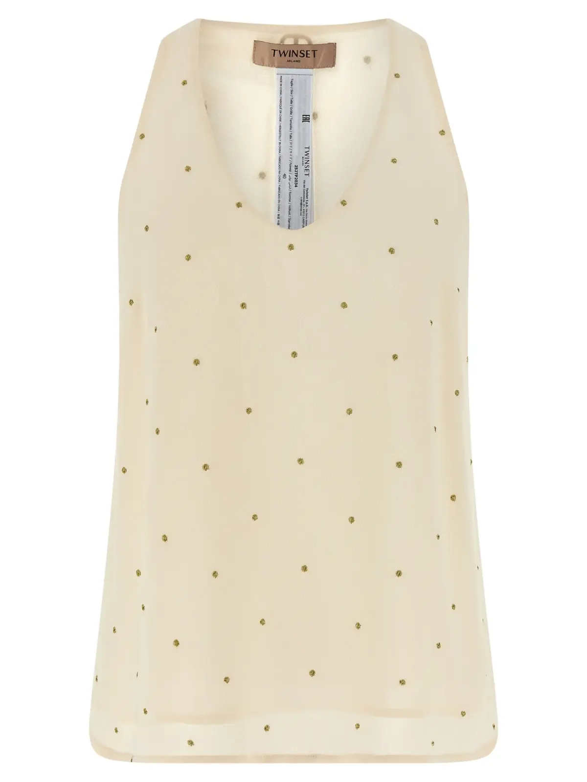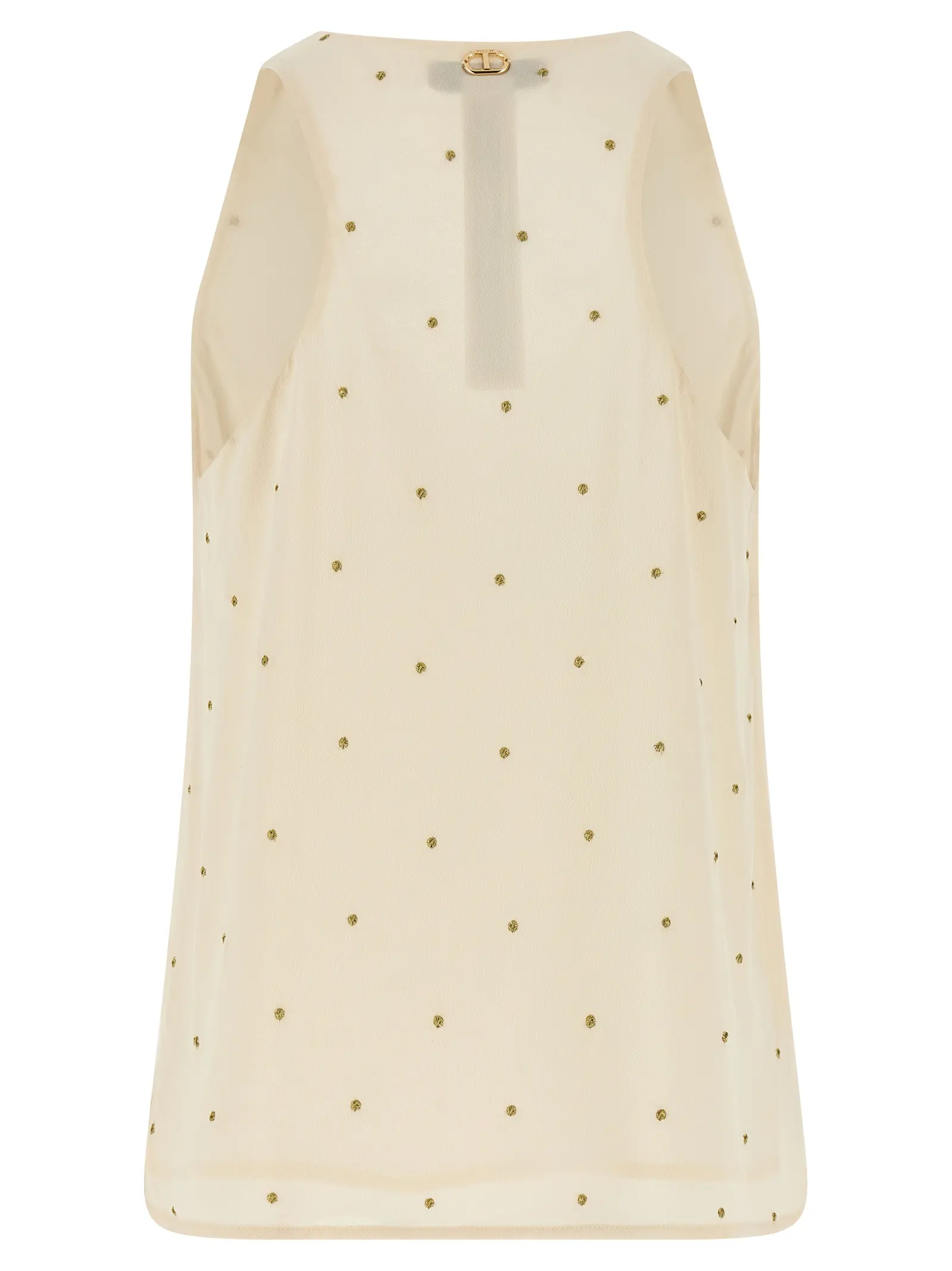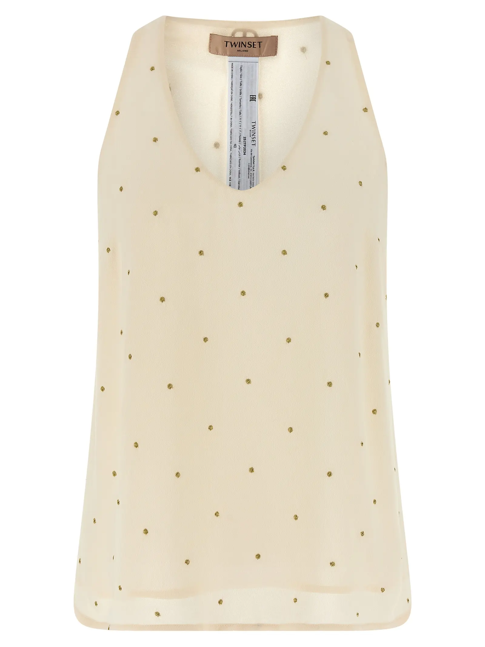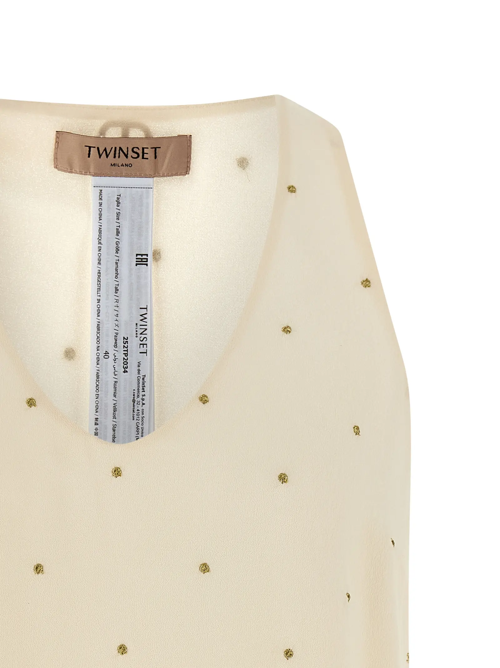 Вишуканий жіночий топ бежевого кольору з тонкої віскози з люрексовою вишивкою, що поєднує легкість і блиск, має круглий виріз та бічні розрізи для комфортної посадки. Цей універсальний виріб підкреслює статус і стиль завдяки бездоганній якості та сучасному дизайну.