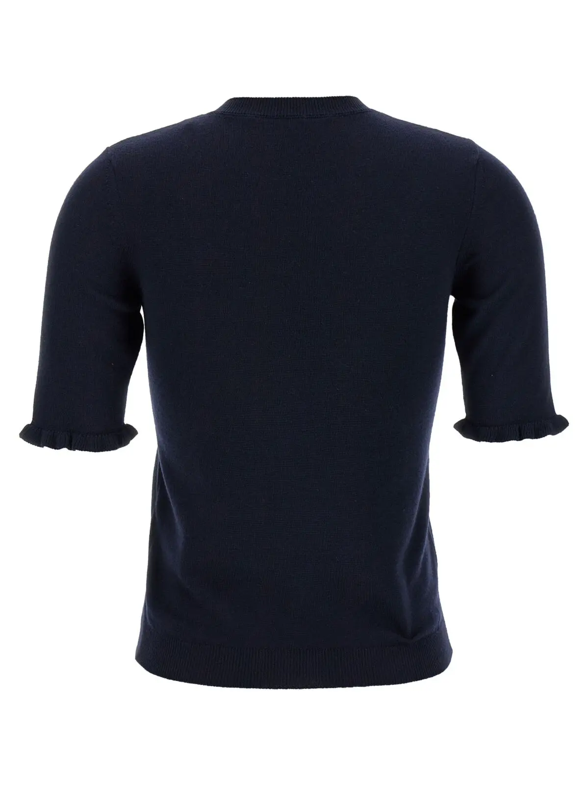 Вишуканий жіночий топ із 100% натуральної вовни першої якості, виконаний у глибокому синьому відтінку з контрастною вишивкою, що підкреслює унікальність та престиж. Елегантний дизайн із круглим вирізом і короткими рукавами з ніжними воланами додає витонченості та універсальності для стильного образу.