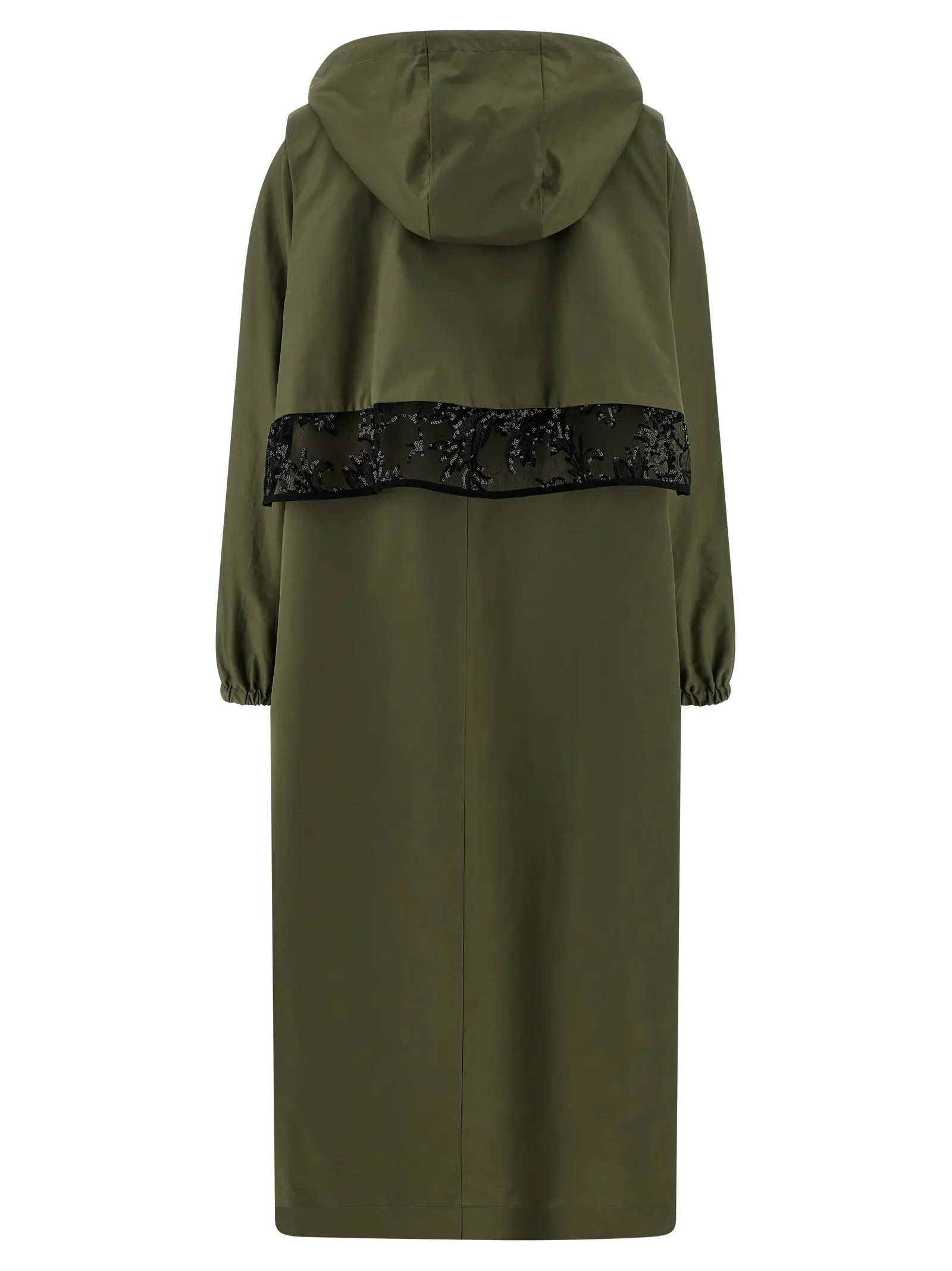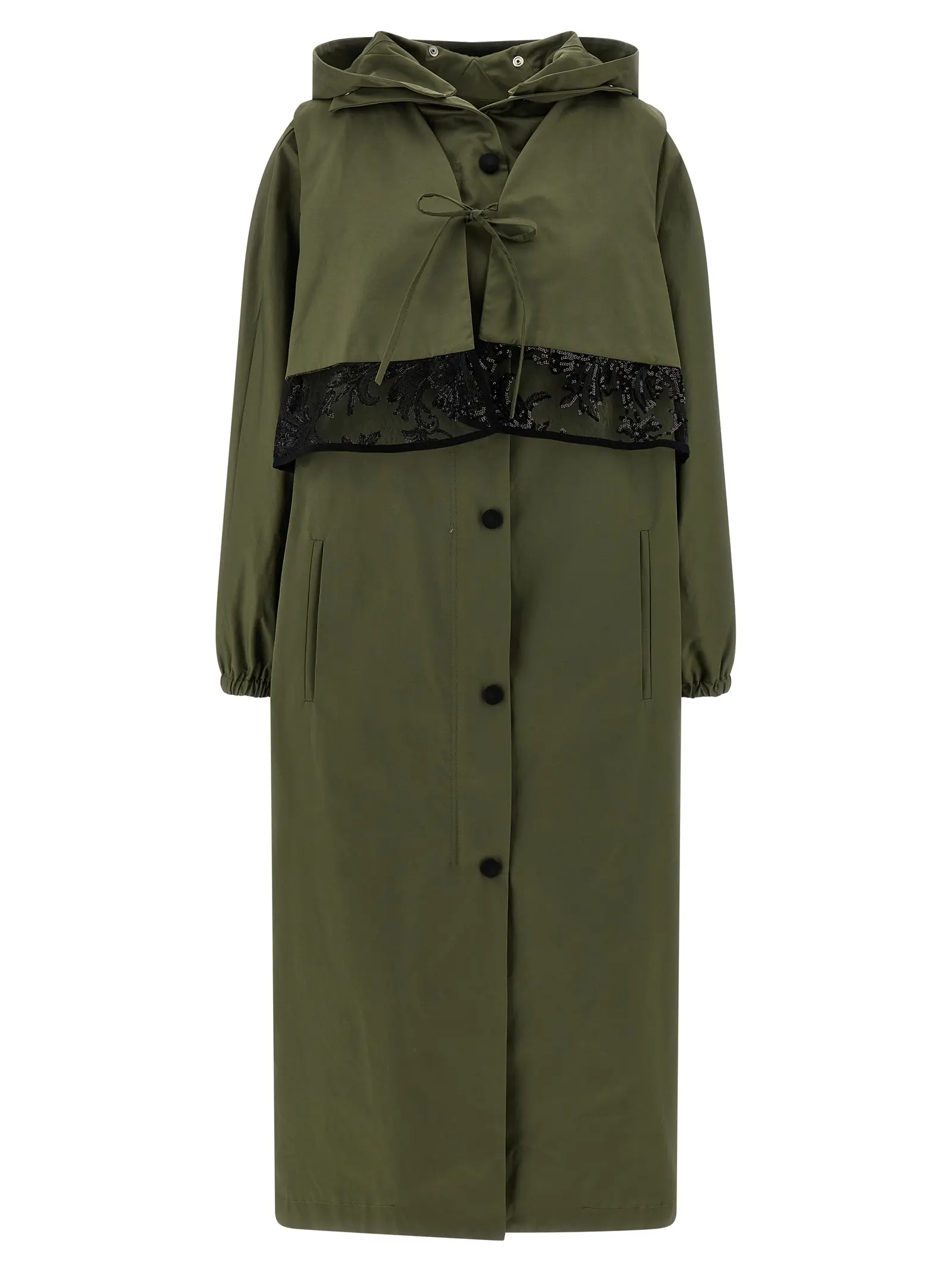 Жіночий тренч Incisa Le Twins у витонченому зеленому відтінку виготовлений із високоякісної бавовняної габардинової тканини з підкладкою, що забезпечує комфорт і довговічність. Інноваційний дизайн включає знімний капюшон та жилетку з мереживними вставками і паєтками, підкреслюючи неперевершену елегантність і універсальність. Застібка на блискавку та кнопки, широкі подовжені рукави з еластичними манжетами і функціональні кишені створюють ідеальний баланс стилю та практичності, надаючи образу статусності та витонченості.