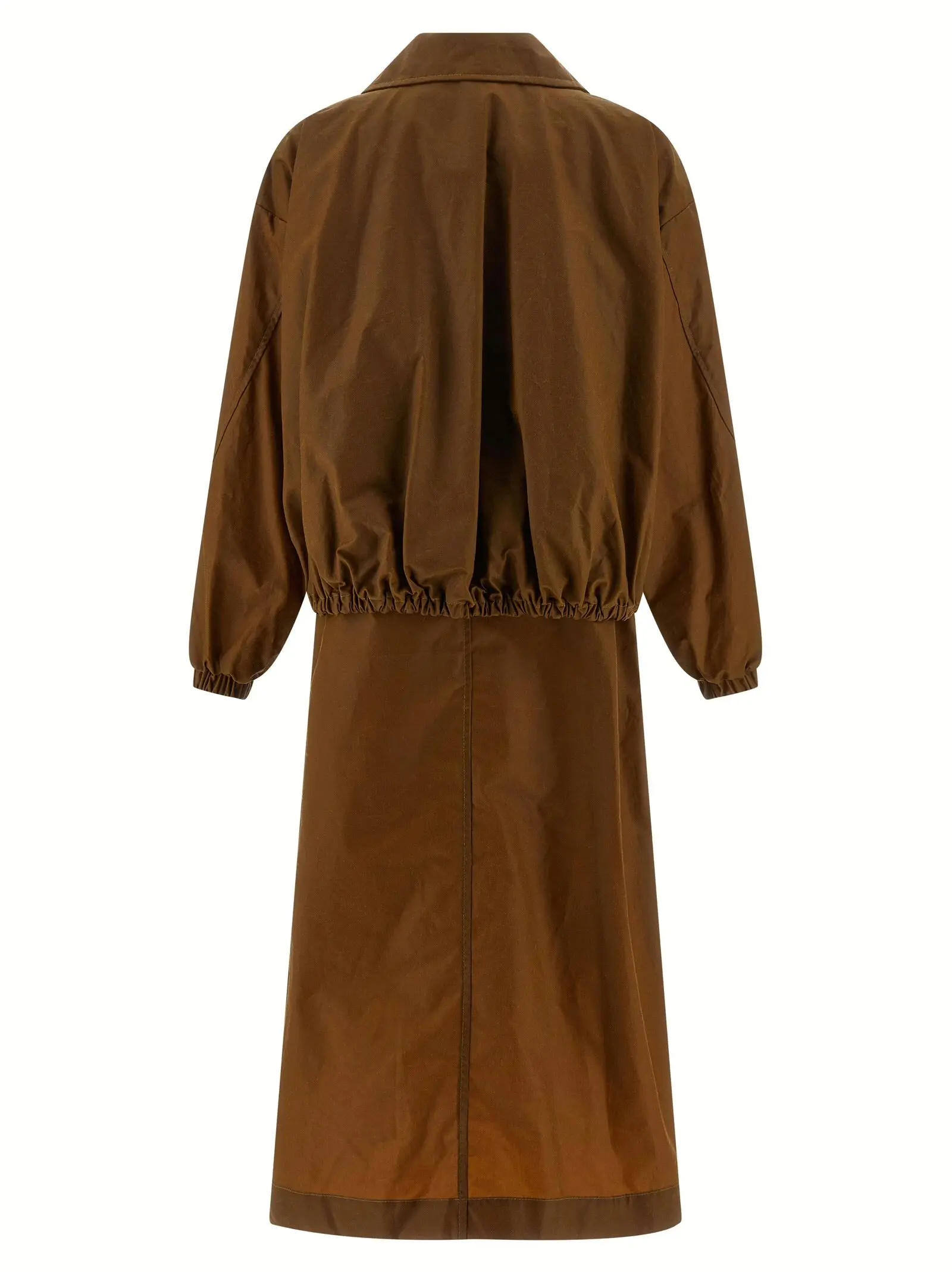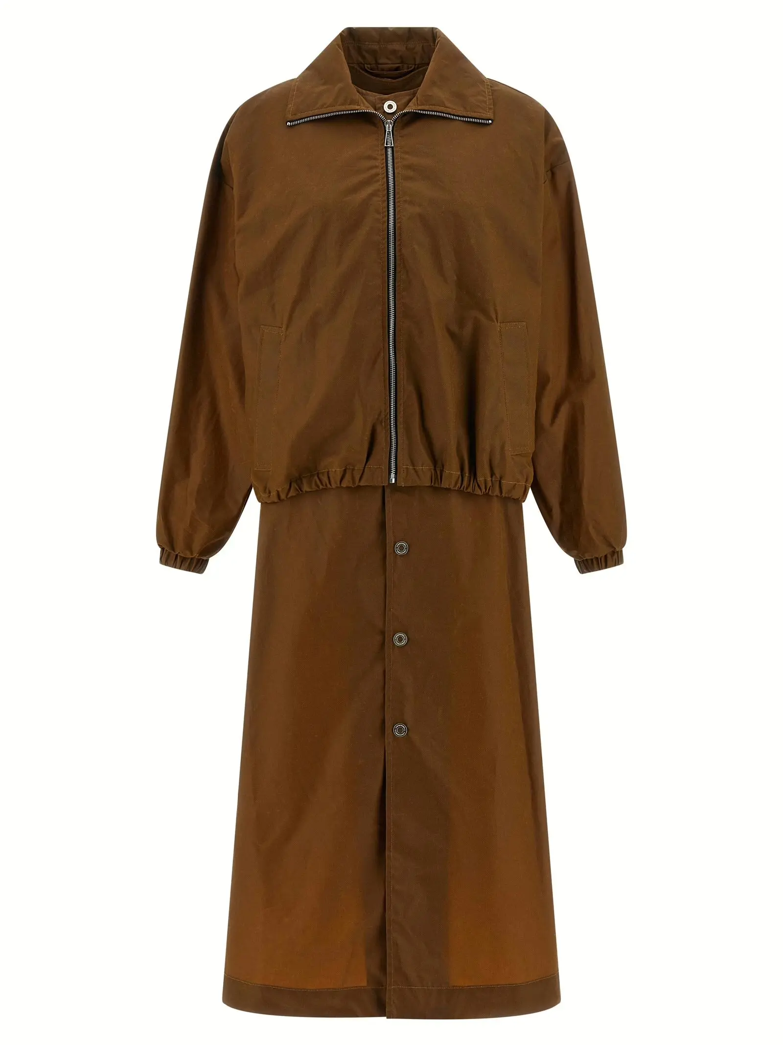 Елегантний жіночий тренч кольору кави, виготовлений з вощеного бавовняного полотна найвищої якості, поєднує інноваційний дизайн із функціональністю. Верхня частина у стилі бомбер з застібкою на блискавку, високим відкладним коміром, довгими манжетами та практичними кишенями створює статусний образ, що підкреслює стиль і універсальність для будь-яких випадків.