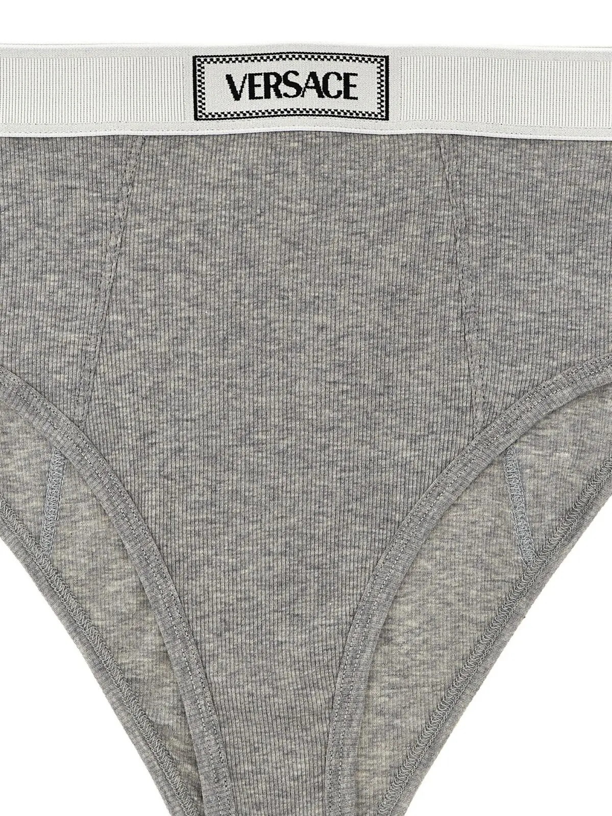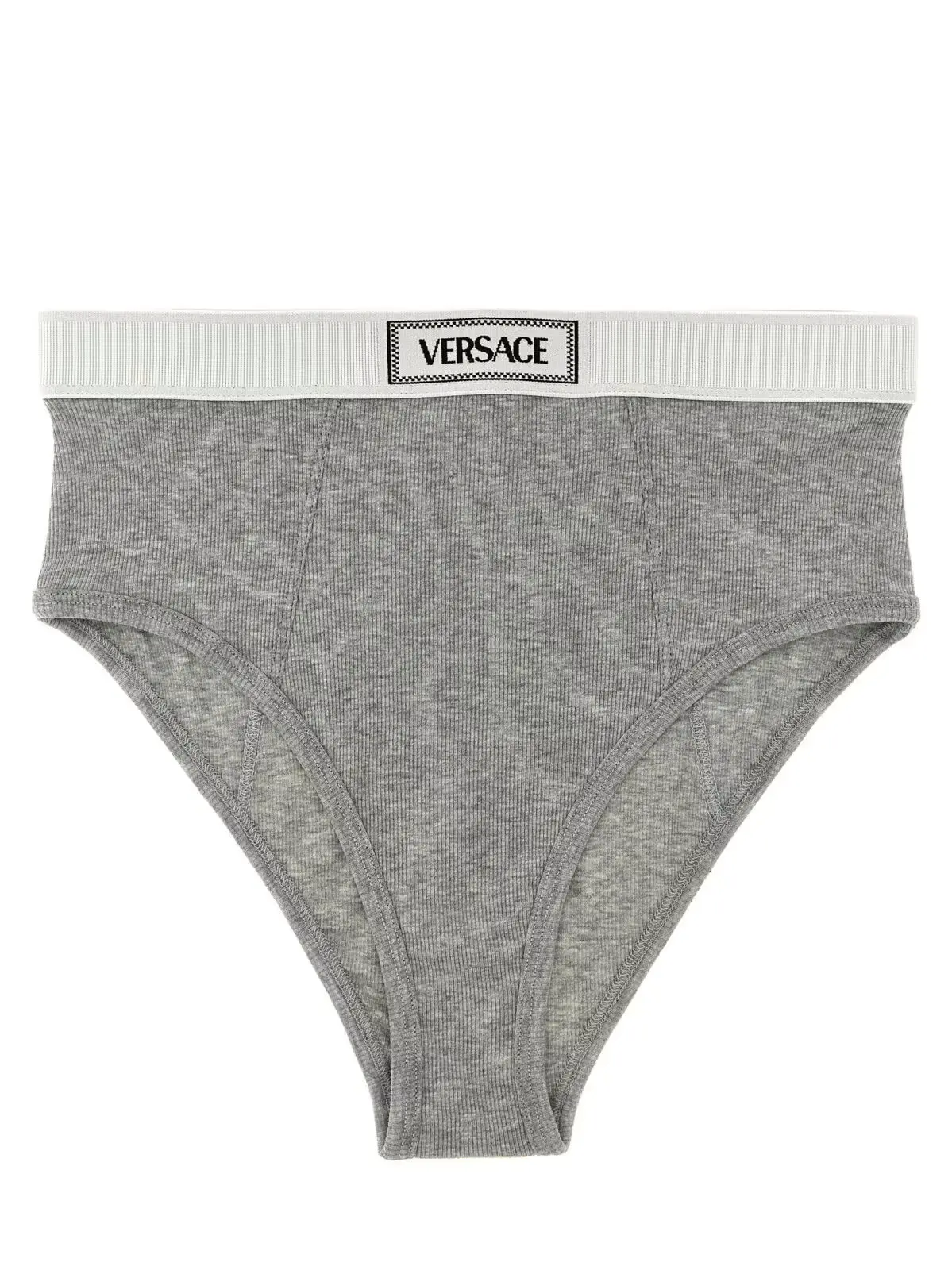 Відчуйте неперевершений комфорт і стиль з жіночими трусиками Versace вінтажного дизайну 90-х. Ці сірі трусики виконані з еластичної ребристої бавовни, що забезпечує ідеальне прилягання і комфорт на весь день. Високий виріз і логотип на еластичній тасьмі додають виробу унікальності та розкоші. Склад: 93% бавовна, 7% еластан. Переживіть елегантність і якість від Versace, що ідеально доповнить ваш гардероб.