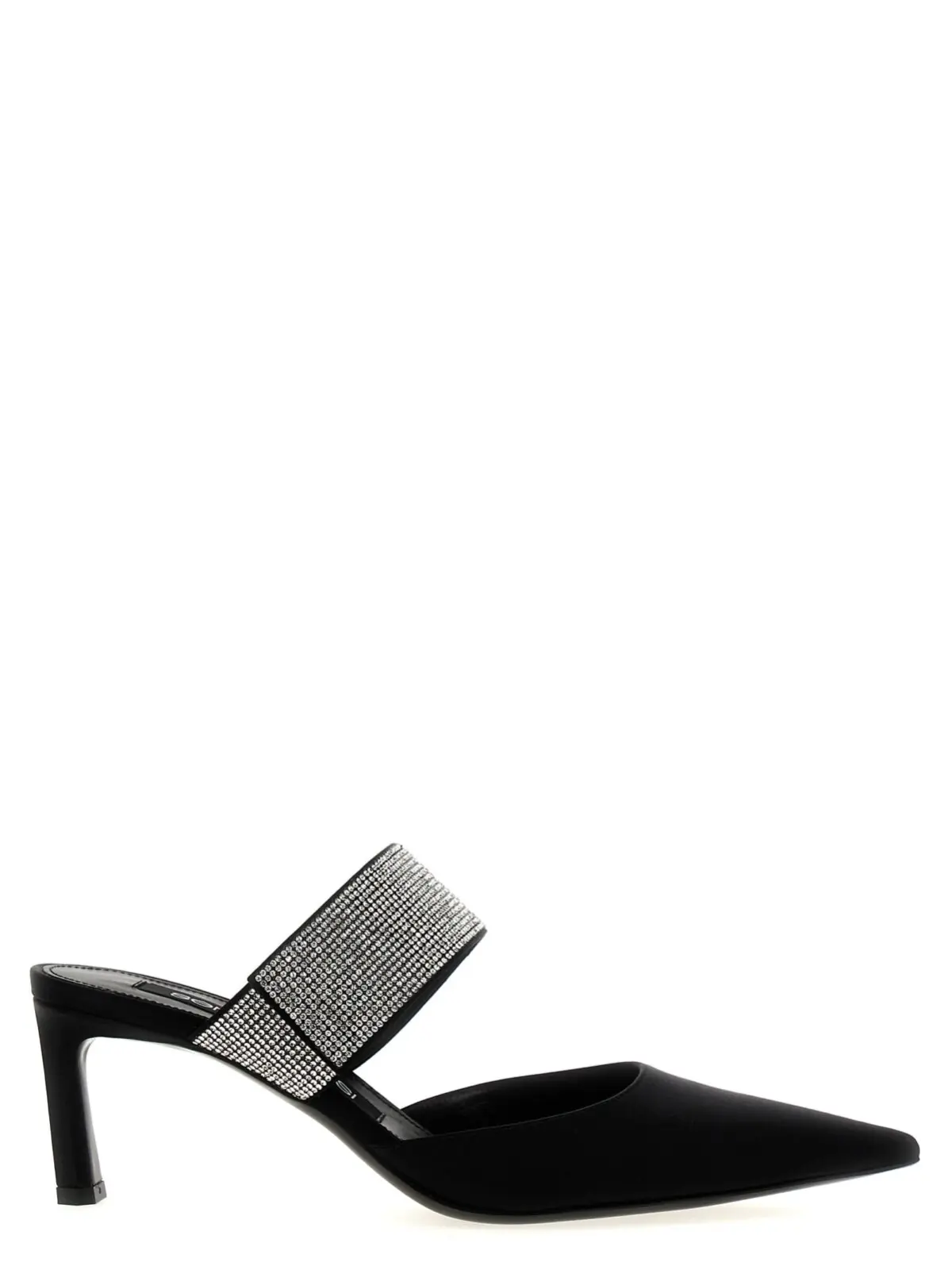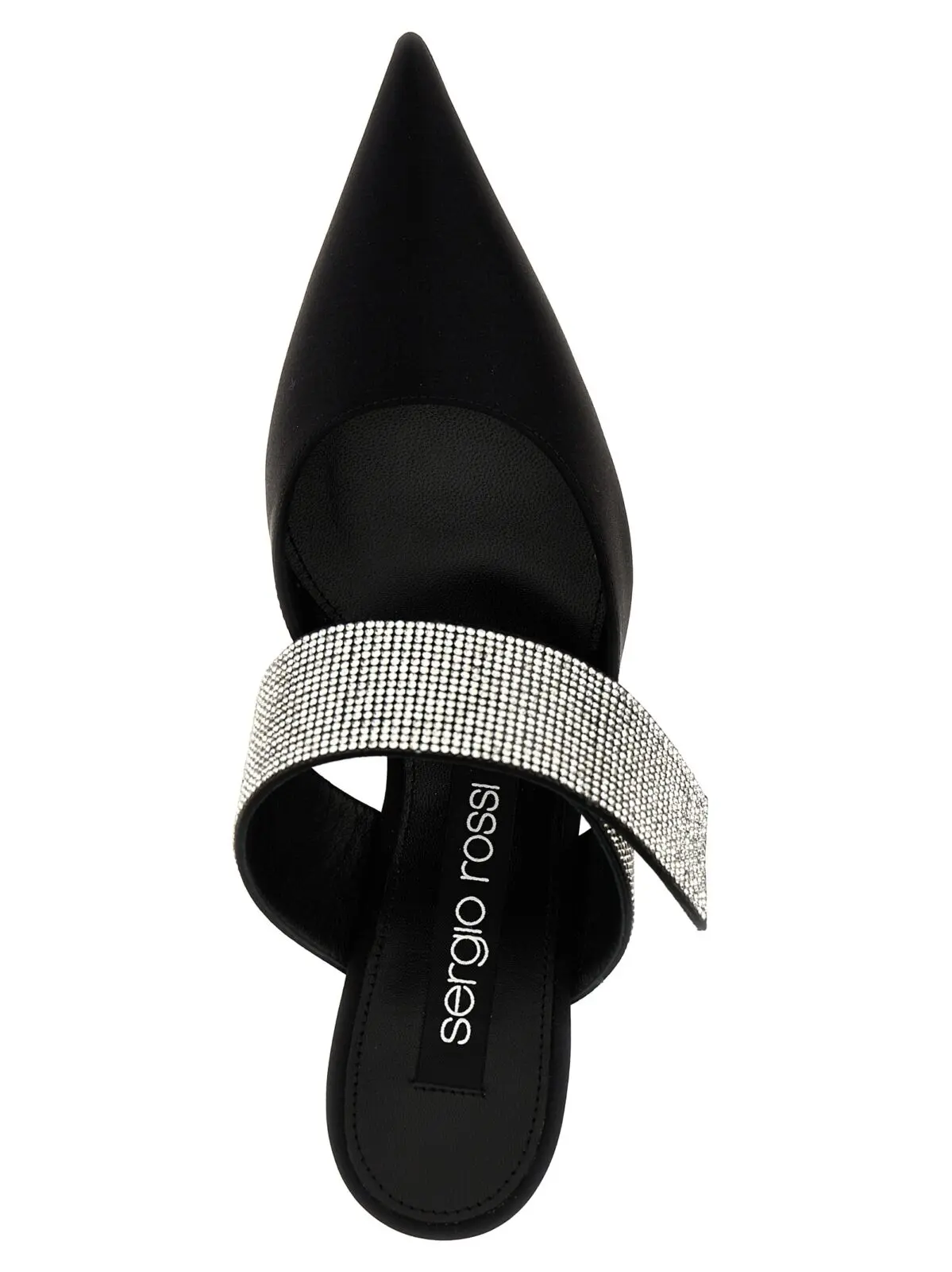 Туфлі Paris mules від Sergio Rossi – це чорні жіночі бабучки з широкою стрічкою, прикрашеною камінням, з високим каблуком. Вони виготовлені з 100% шовку.