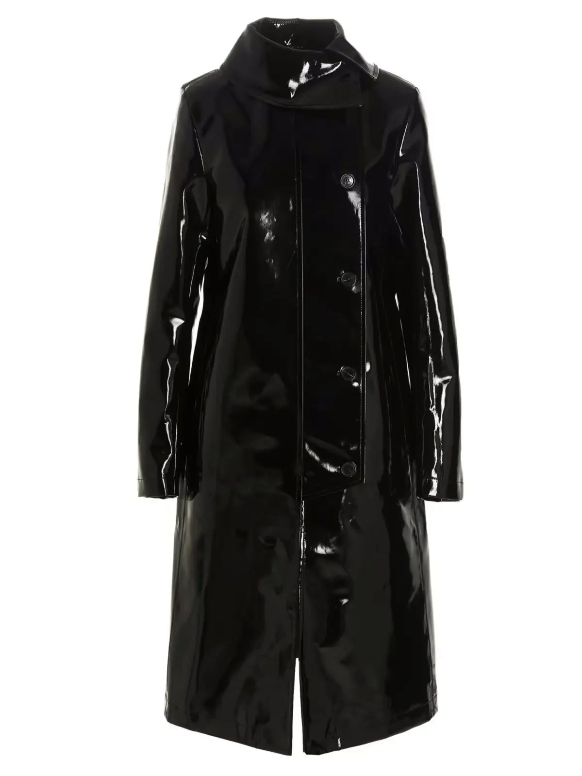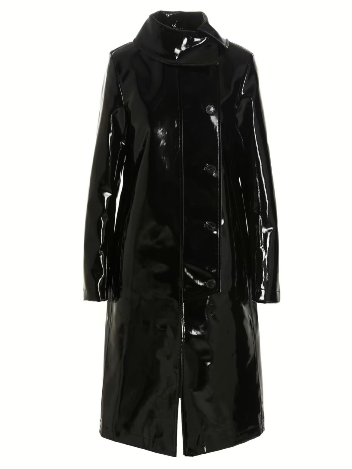 Вініловий тренч Raf Simons – це чорний жіночий плащ з кнопковим застібкою, кишенями, довгими рукавами і комірцем. Виготовлений з 100% бавовни.