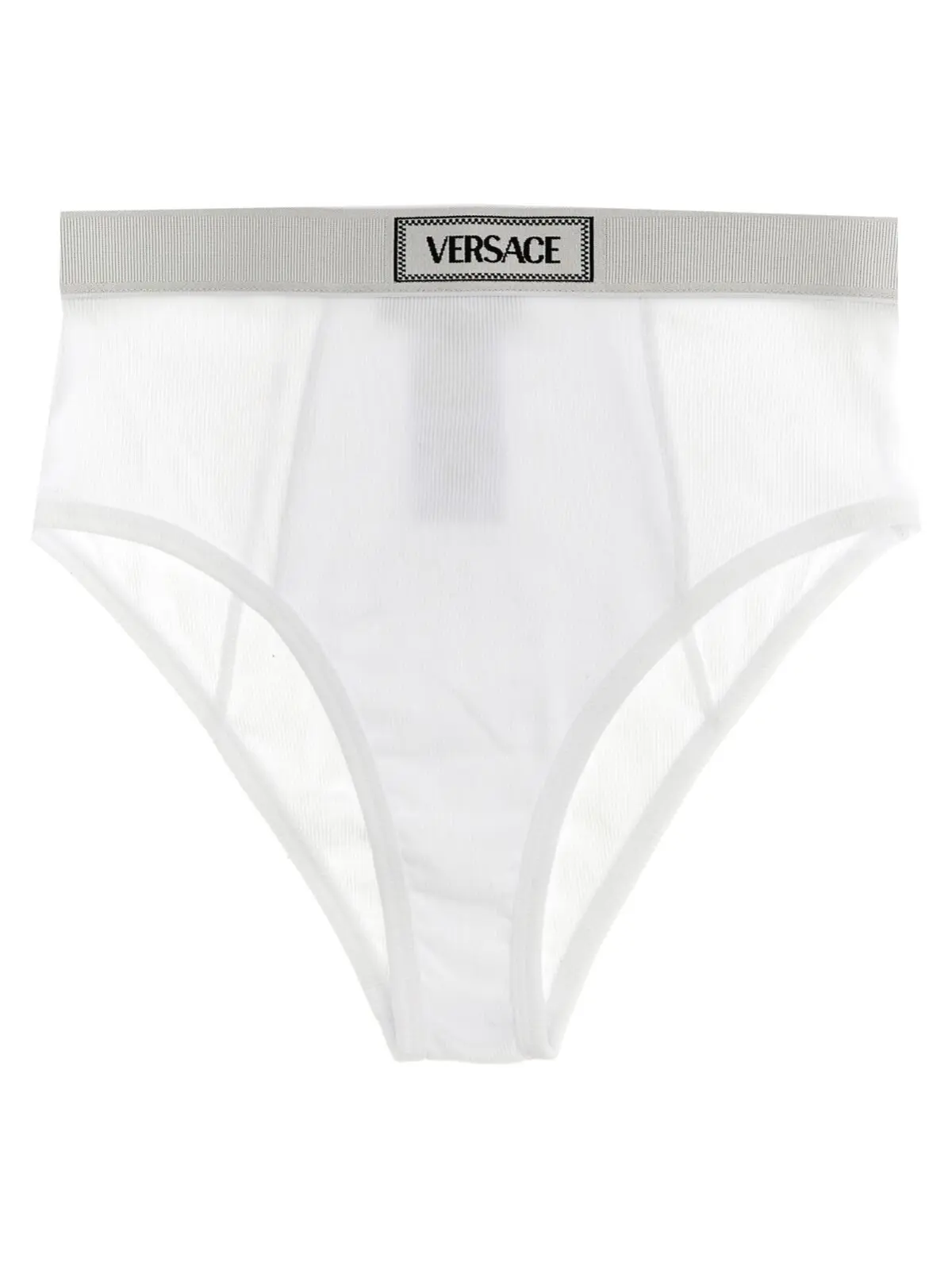 Оригінальний вінтажний бюстгальтер Versace з 90-х в білому кольорі. Жіночий, з ребристої бавовни, прикрашений логотипом на еластичній стрічці. Склад: 93% бавовна, 7% еластан.