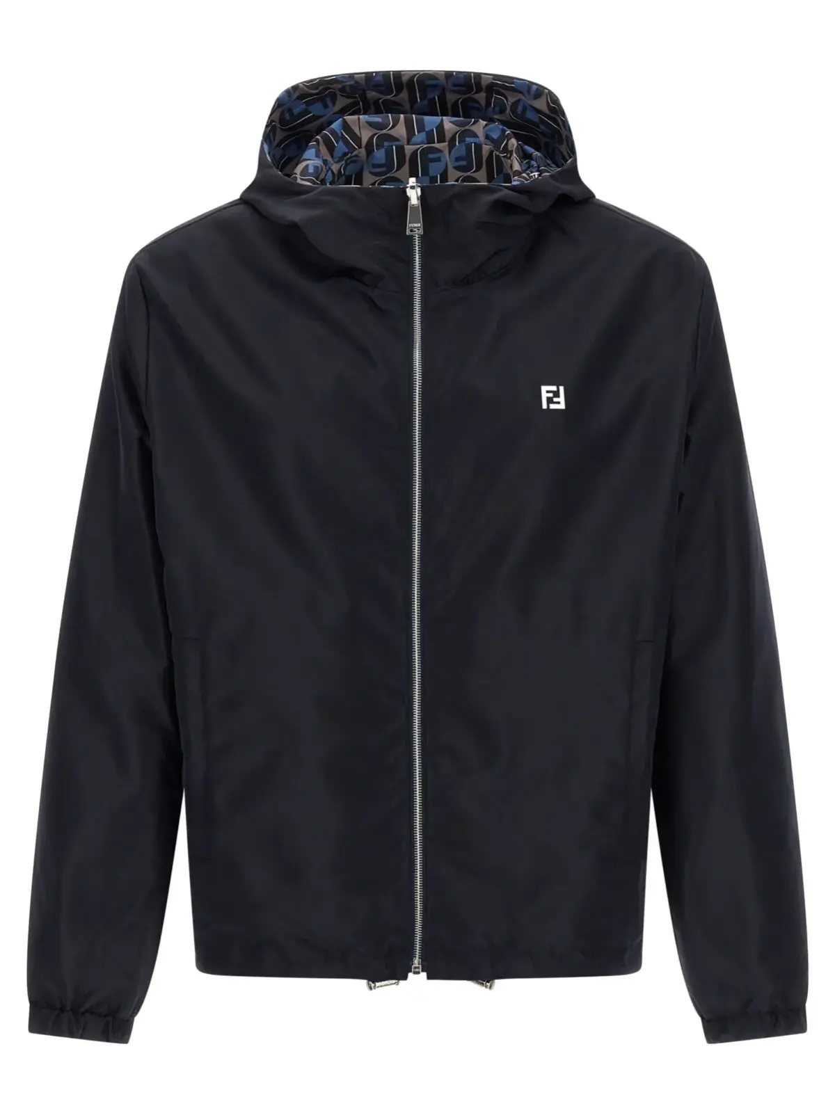 Двостороння вітрівка Fendi Fendinity виконана з інноваційної технічної тканини 100% поліестер, поєднує елегантний синій колір з фірмовим принтом, оснащена регульованим капюшоном, металевим логотипом, застібкою-блискавкою та функціональними кишенями. Витонченість дизайну та універсальність роблять цю модель ідеальним вибором для стильних чоловіків, що цінують якість і статус.