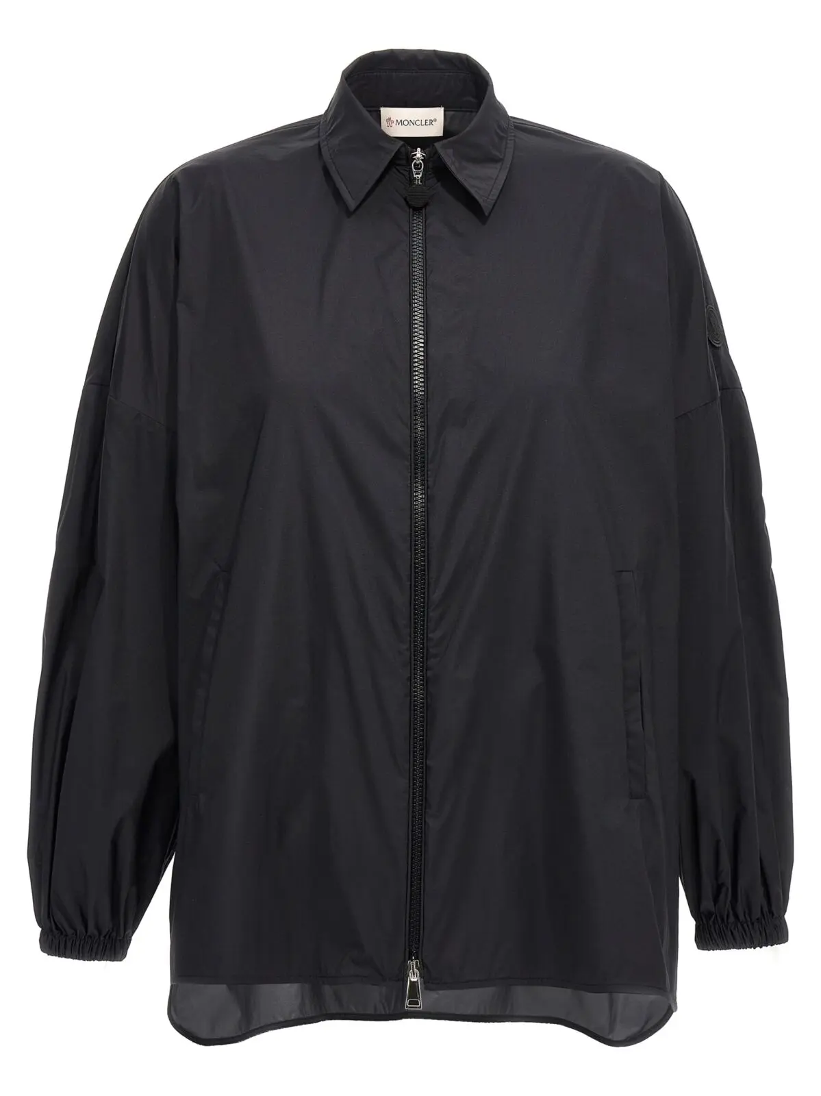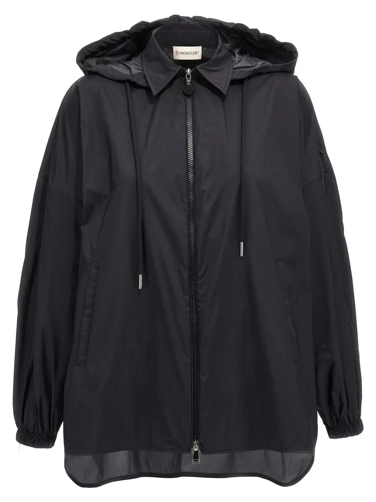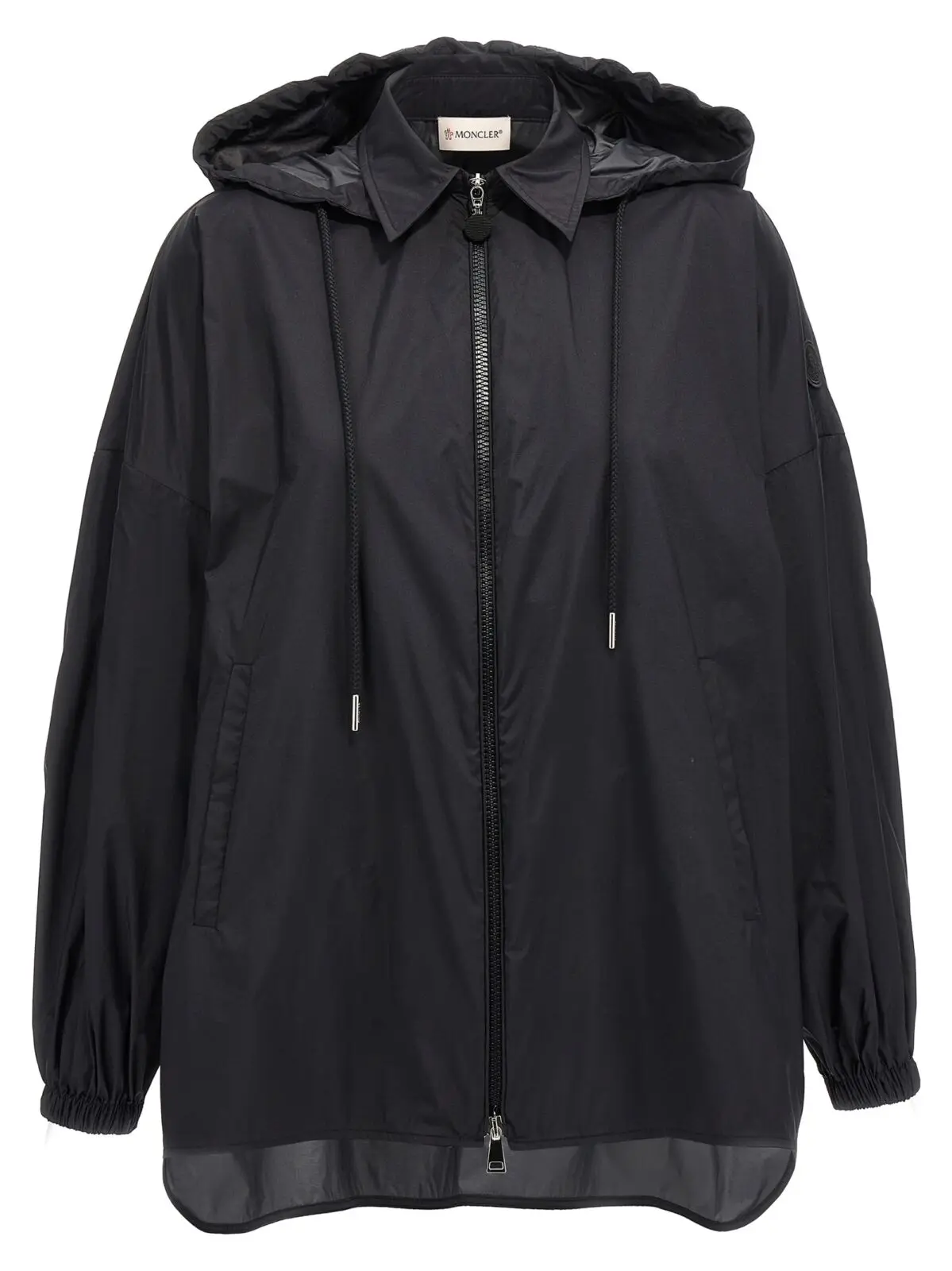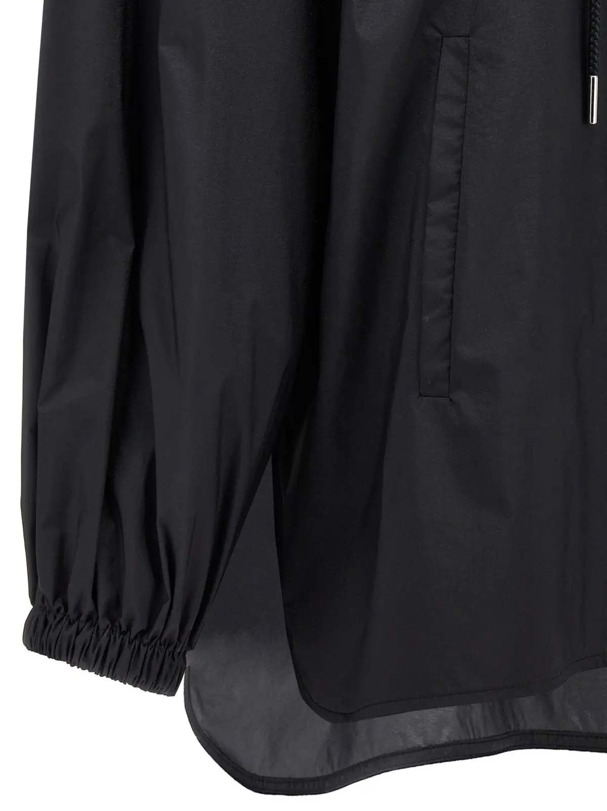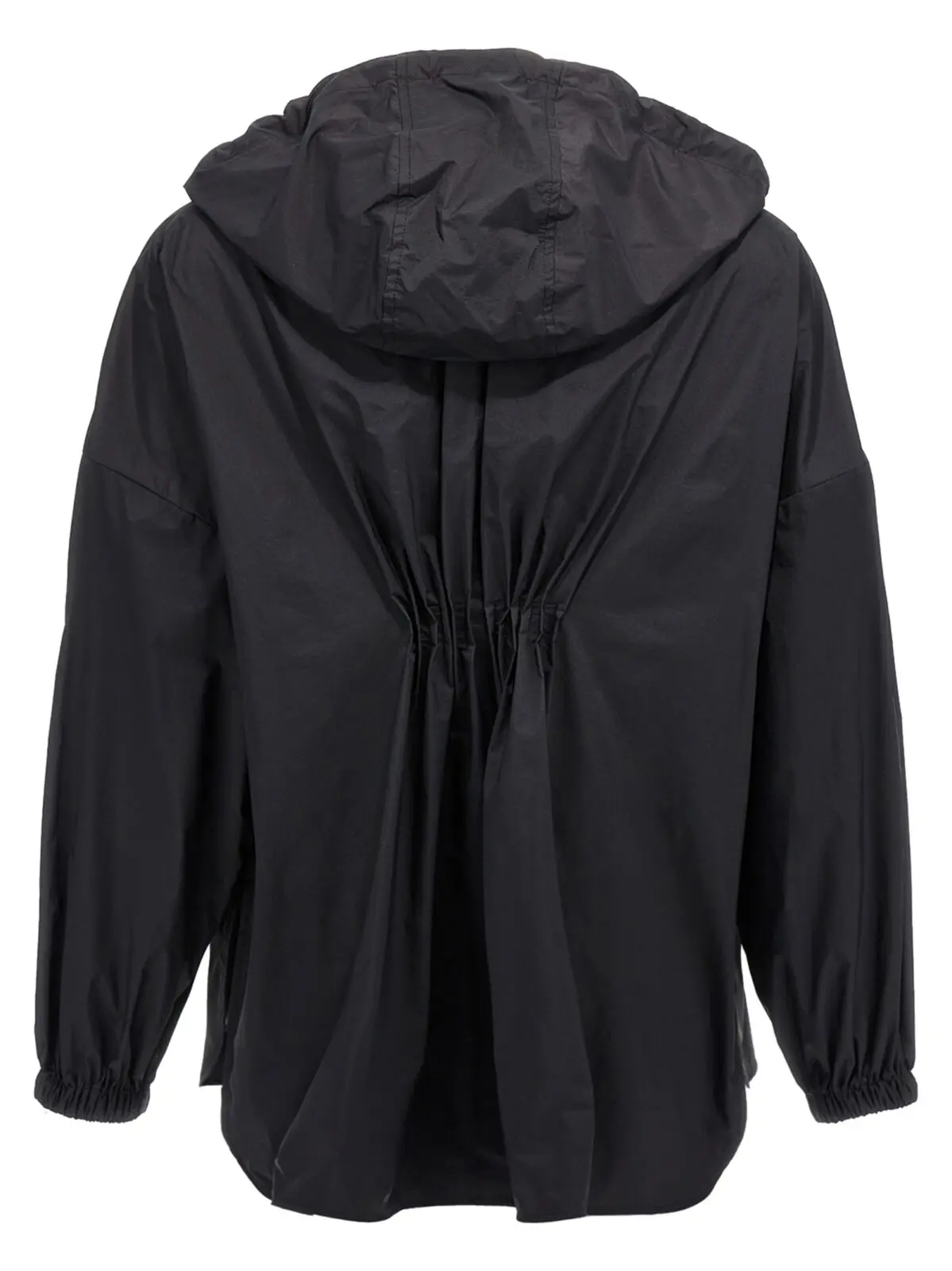 Чорна вітровка з технічної тканини без підкладки поєднує інноваційний дизайн із вишуканими деталями, такими як оборка на спині та знімний капюшон з коміром-сорочкою. Функціональна модель з довгими рукавами, еластичними манжетами, кишенями та асиметричним подолом підкреслює статус і стиль, гарантуючи комфорт і універсальність у будь-яких умовах.