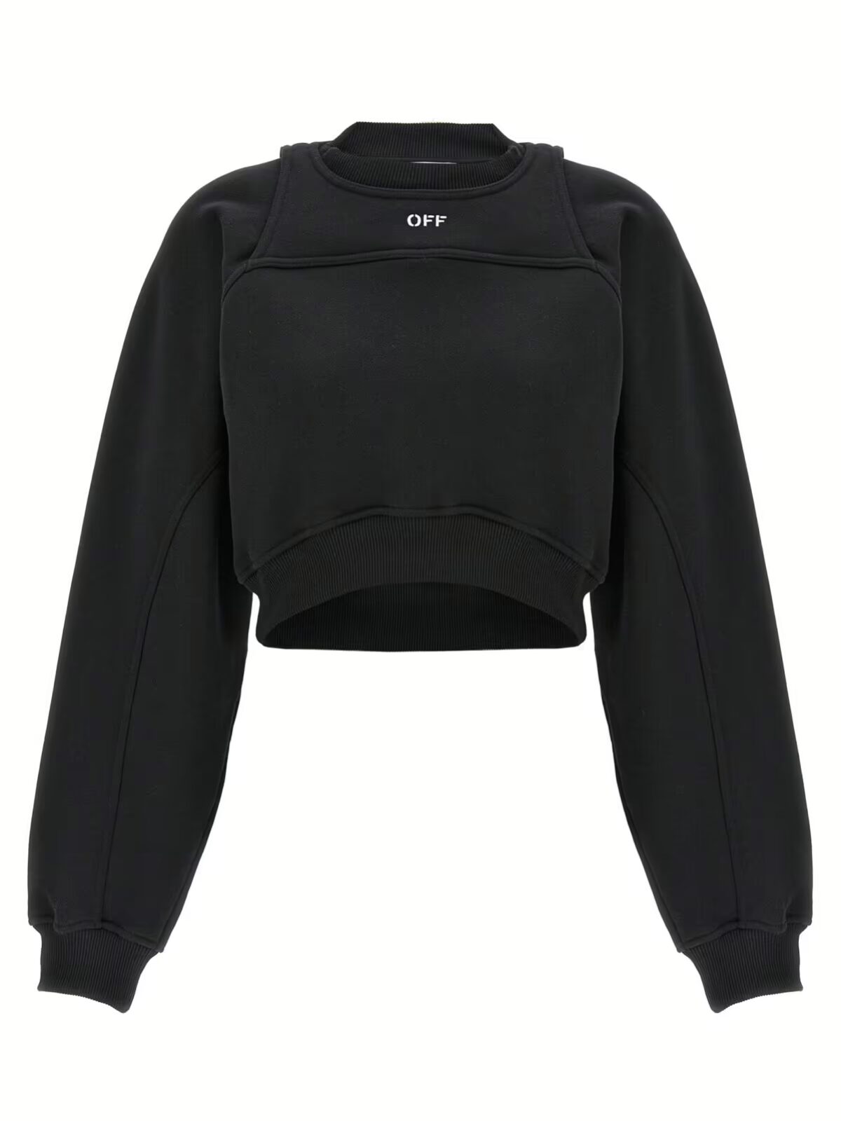Вкорочений світшот Off-White чорно-білий для жінок – стильний елемент вашого гардеробу. Виконаний з 100% бавовни, він забезпечує комфорт та зручність на кожен день. Унікальний дизайн з деталями у вигляді ременів на плечах додає оригінальності, а вишитий логотип спереду підкреслює вашу індивідуальність. Ідеально пасує для створення модного образу у міському стилі.