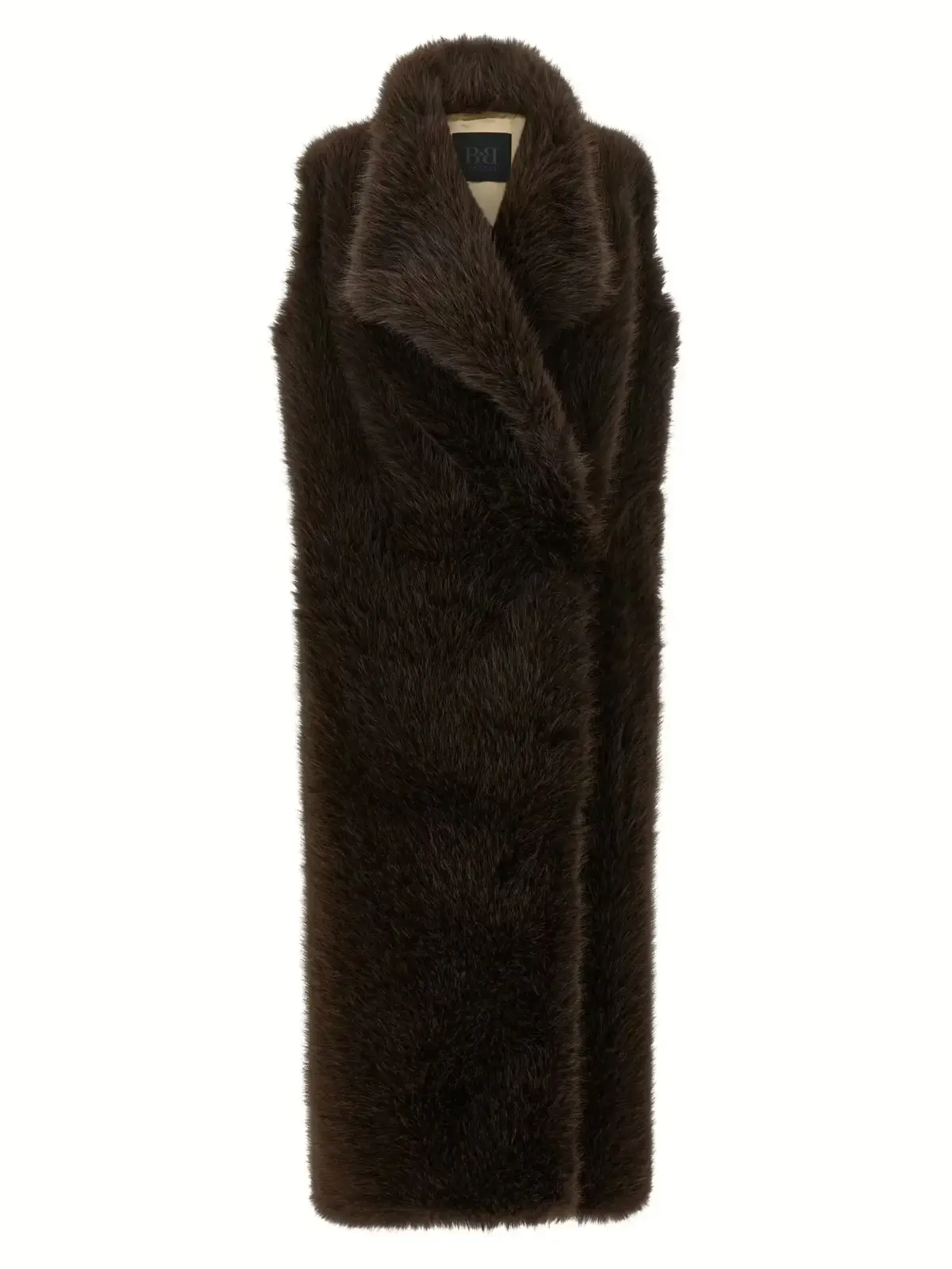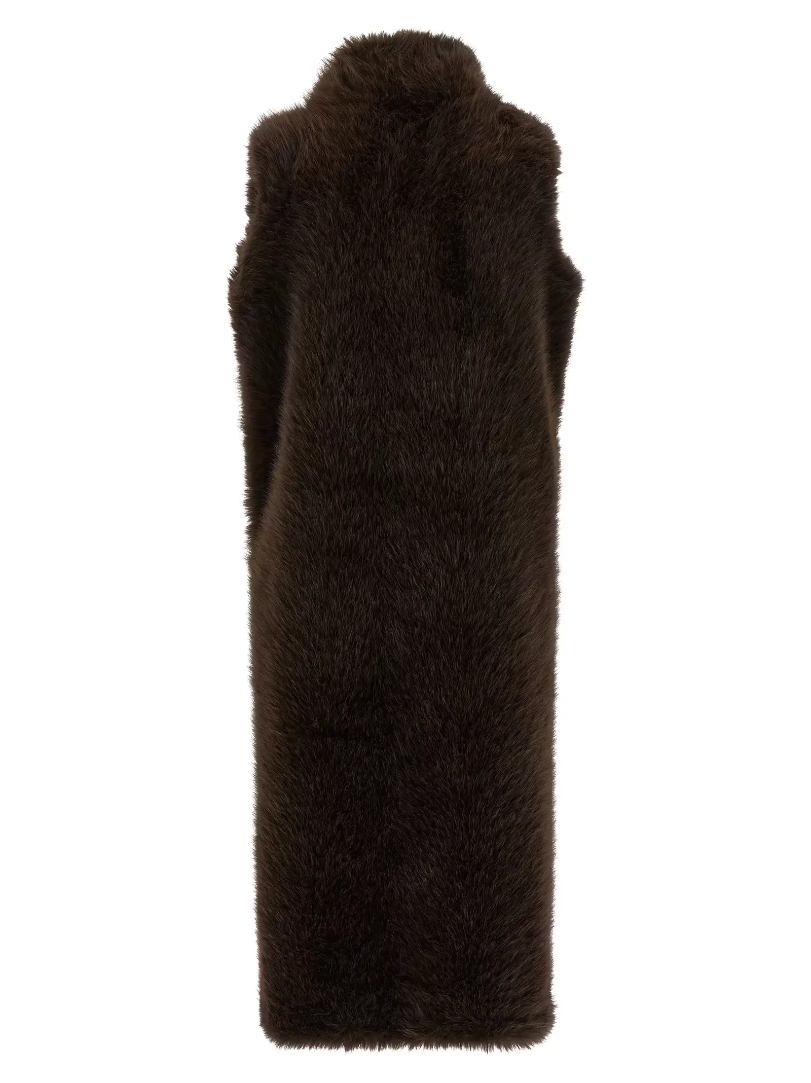 Цей довгий жіночий жилет з коричневого штучного хутра виготовлений із високоякісного поліестеру, поєднуючи інноваційний дизайн і практичність без застібок із функціональними боковими кишенями. Вишуканий виріб підкреслює статус і стиль, даруючи універсальність і неперевершену елегантність.