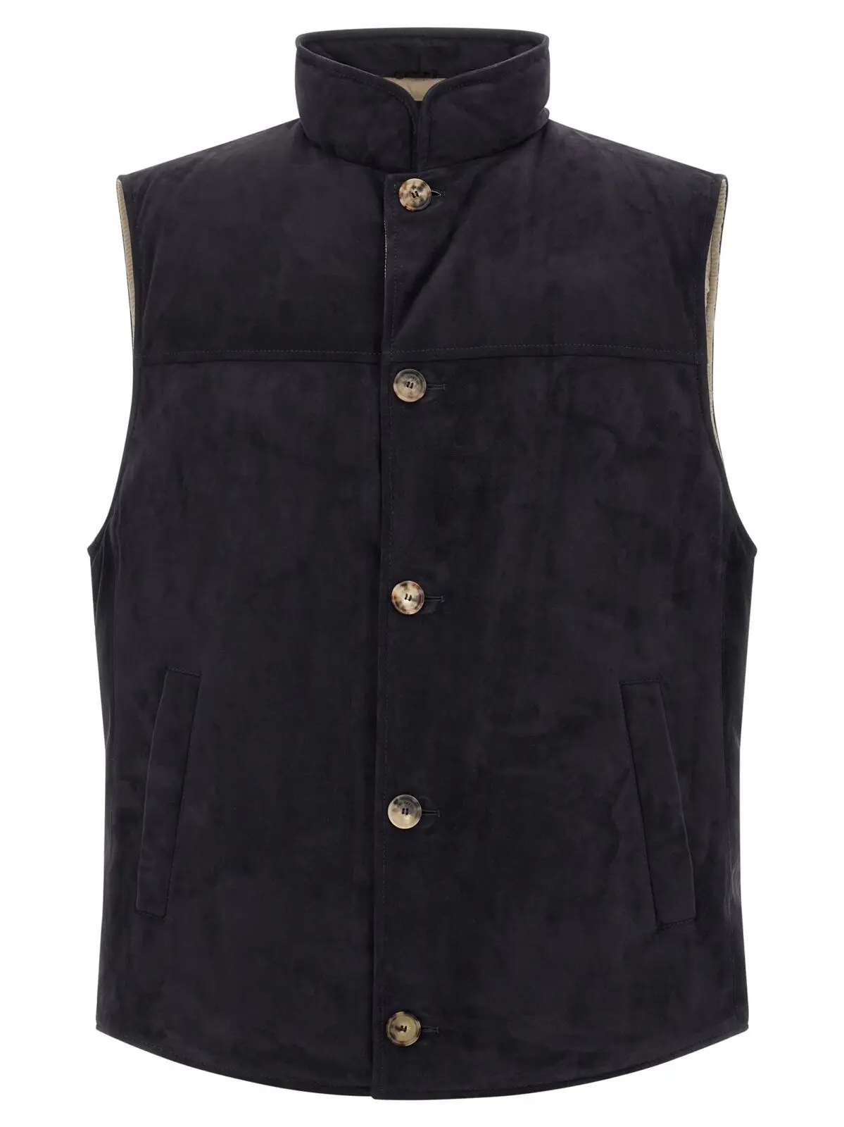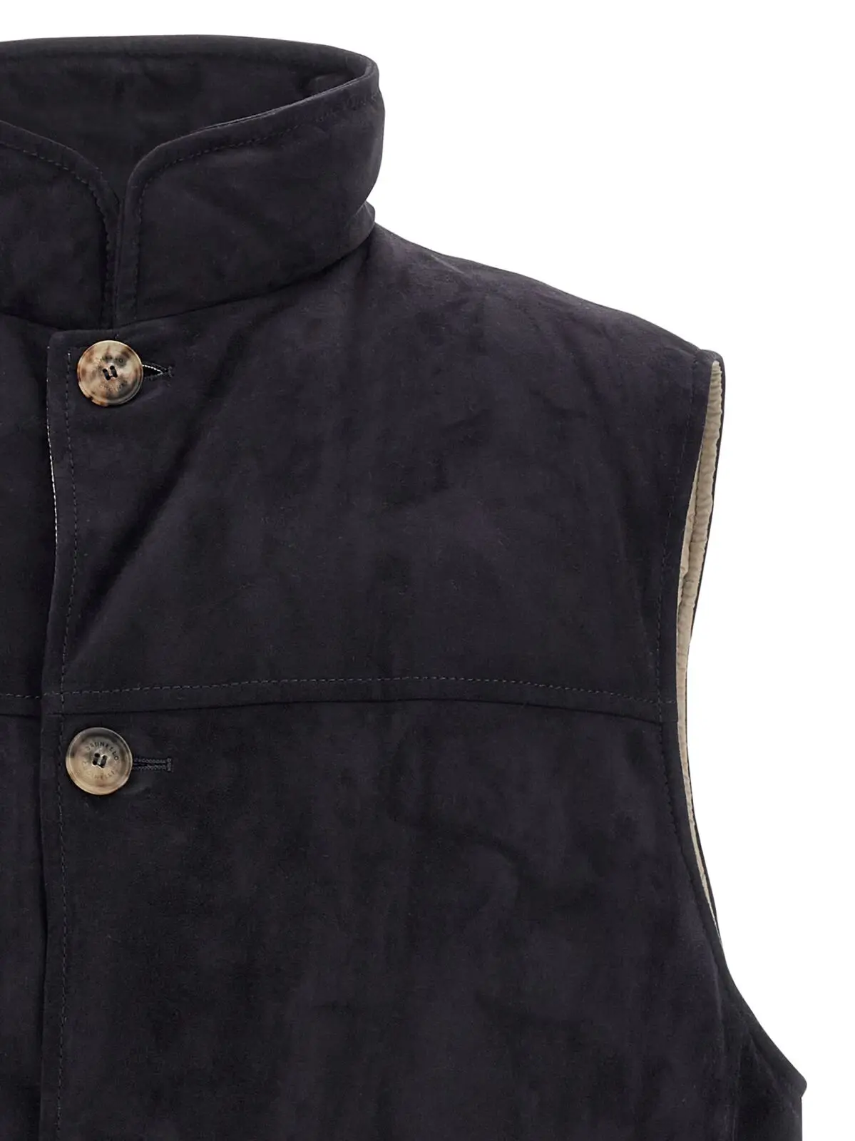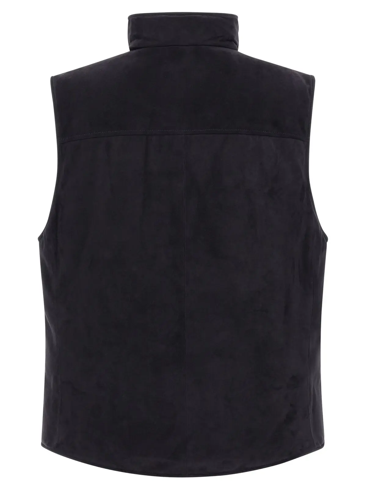 Елегантний чоловічий жилет із замші насиченого синього відтінку, виготовлений із натуральної овечої шкіри найвищої якості. Контрастна стьобана підкладка з утепленням із гусиного пуху забезпечує неперевершений комфорт і тепло, а високий комір і класична застібка на ґудзики додають виробу вишуканості та функціональності. Цей виріб ідеально поєднує інноваційність із універсальністю, підкреслюючи статус і бездоганний стиль сучасного чоловіка.
