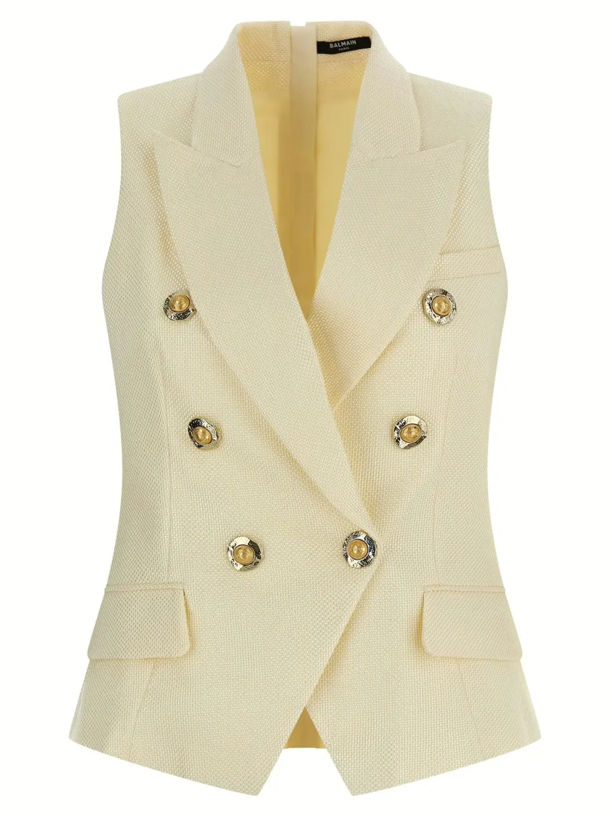 Цей жіночий білий жилет виконаний із суміші віскози та бавовни, поєднуючи інноваційний дизайн з неперевершеною якістю. Подвійна застібка з декоративними металевими ґудзиками у вигляді золотих монет, максі плечі та асиметричний край створюють вишуканий і статусний образ, що підкреслює елегантність і універсальність вашого стилю.