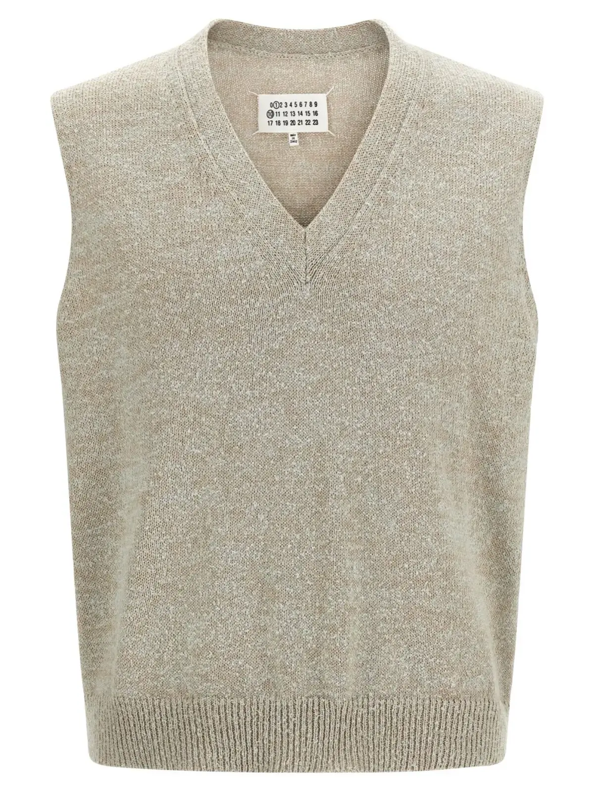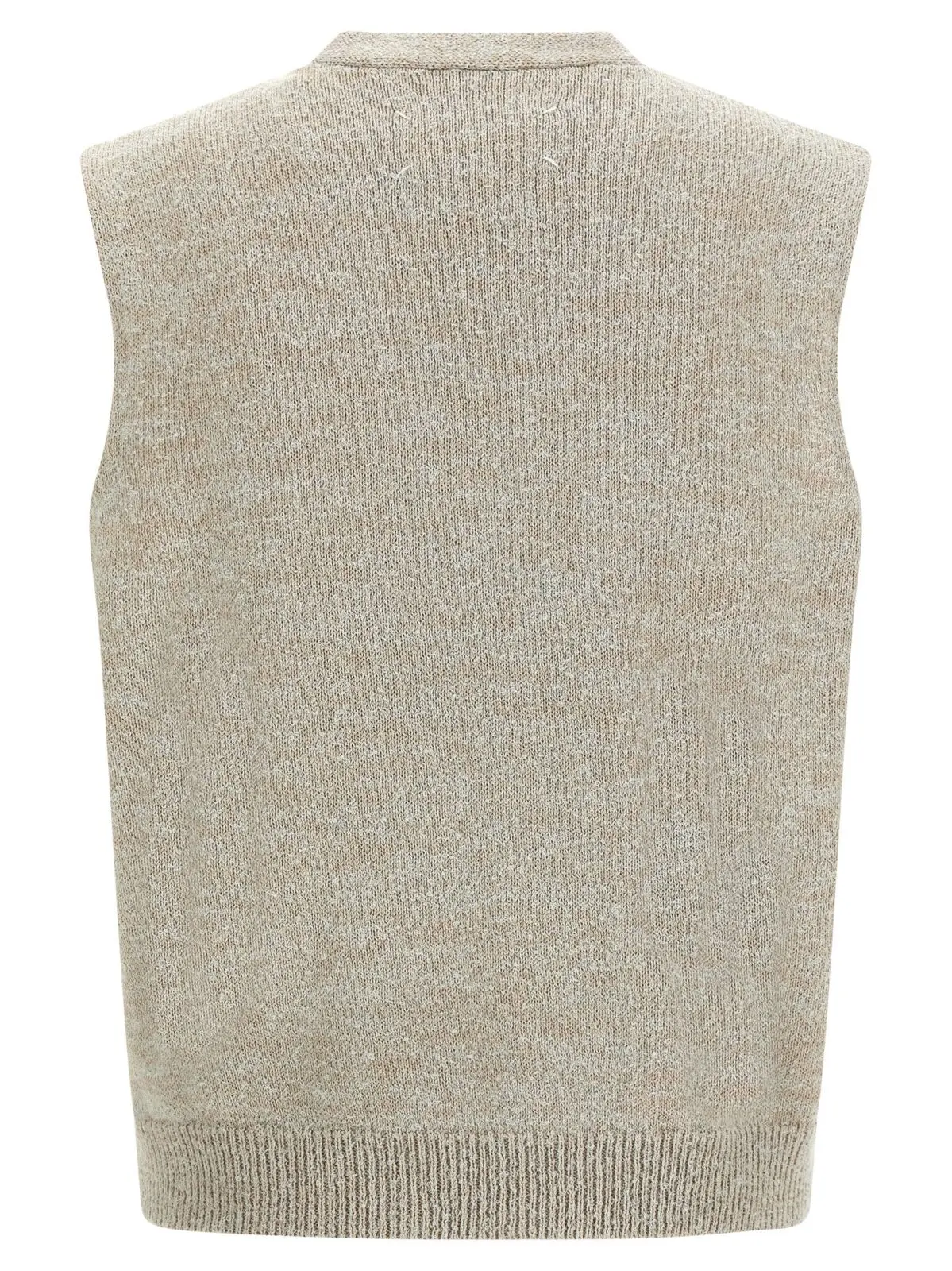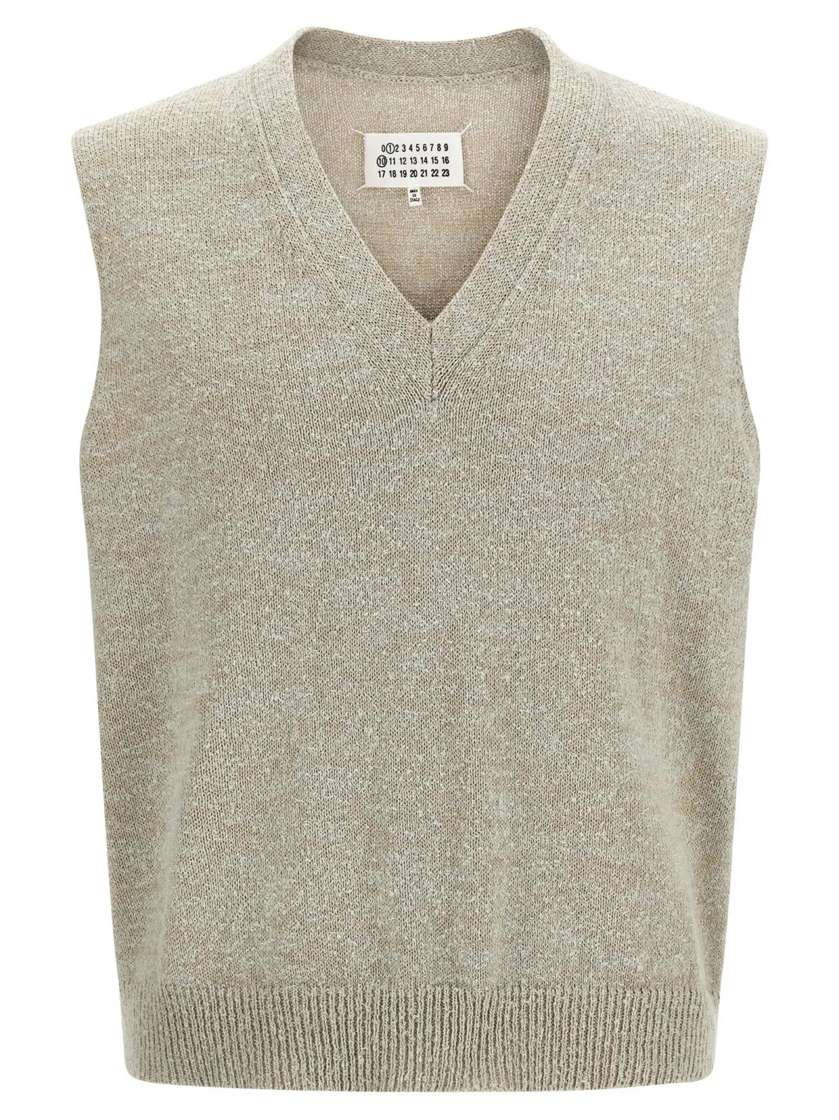 Чоловічий жилет Maison Margiela з бежевого букле, виконаний з преміальних натуральних матеріалів, поєднує комфорт і легкість завдяки вмісту бавовни, вовни та еластану. Вишуканий дизайн із глибоким V-подібним вирізом та фірмовою деталлю на спині підкреслює статус і стиль, роблячи цей виріб універсальним вибором для сучасного гардероба.