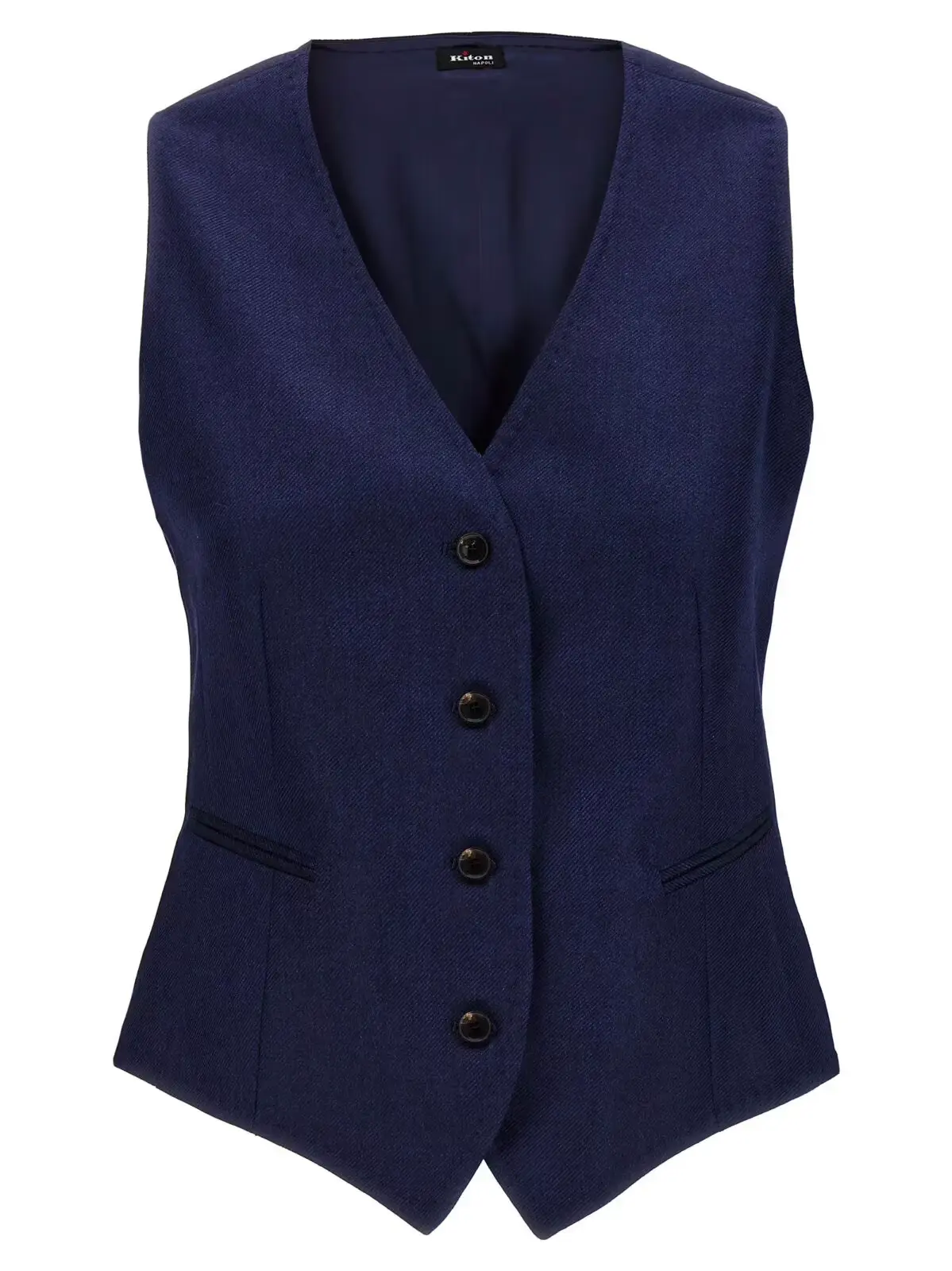 Цей жилет від Kiton зроблений з кашеміру та шовку і має застібку на гудзики та кишені. Він виготовлений з 70% кашеміру та 30% шовку. Жилет має синій колір.