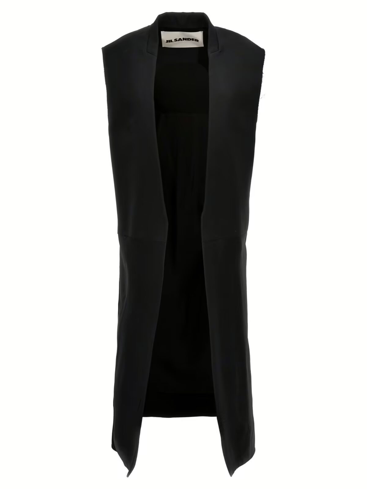 Жилет Jil Sander – це довгий двоматеріальний жилет, який виготовлений з 100% віскози. Верхня частина жилета виконана з тканини верхнього шару, а нижня частина – з рідиноподібної сатинової тканини. Жилет має знімний ремінь з застібкою без пряжки. Чорний колір жилета додає йому стильності та елегантності. Цей жилет стане відмінним доповненням до вашого гардеробу, надаючи вам комфорт та стиль у будь-якій ситуації.